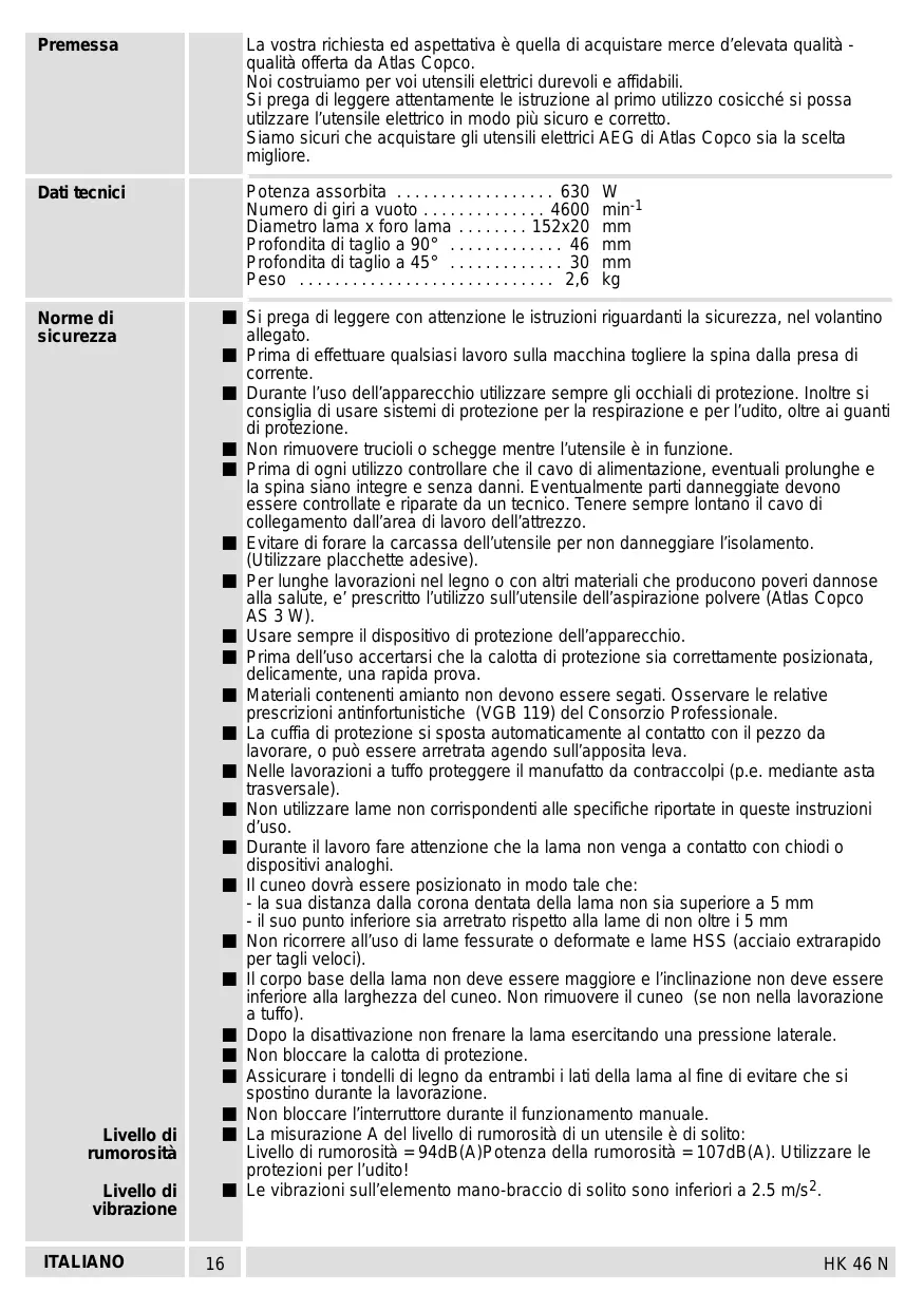 - HK 46 N Premessa La vostra richiesta ed aspettativa è quella di acquistare merce d’elevata qualità qualità offerta da Atlas Copco. Noi costruiamo per voi utensili elettrici durevoli e affidabili. Si prega di leggere attentamente le istruzione al primo utilizzo cosicché si possa utilzzare l’utensile elettrico in modo più sicuro e corretto. Siamo sicuri che acquistare gli utensili elettrici AEG di Atlas Copco sia la scelta migliore. Dati tecnici Potenza assorbita p. 630