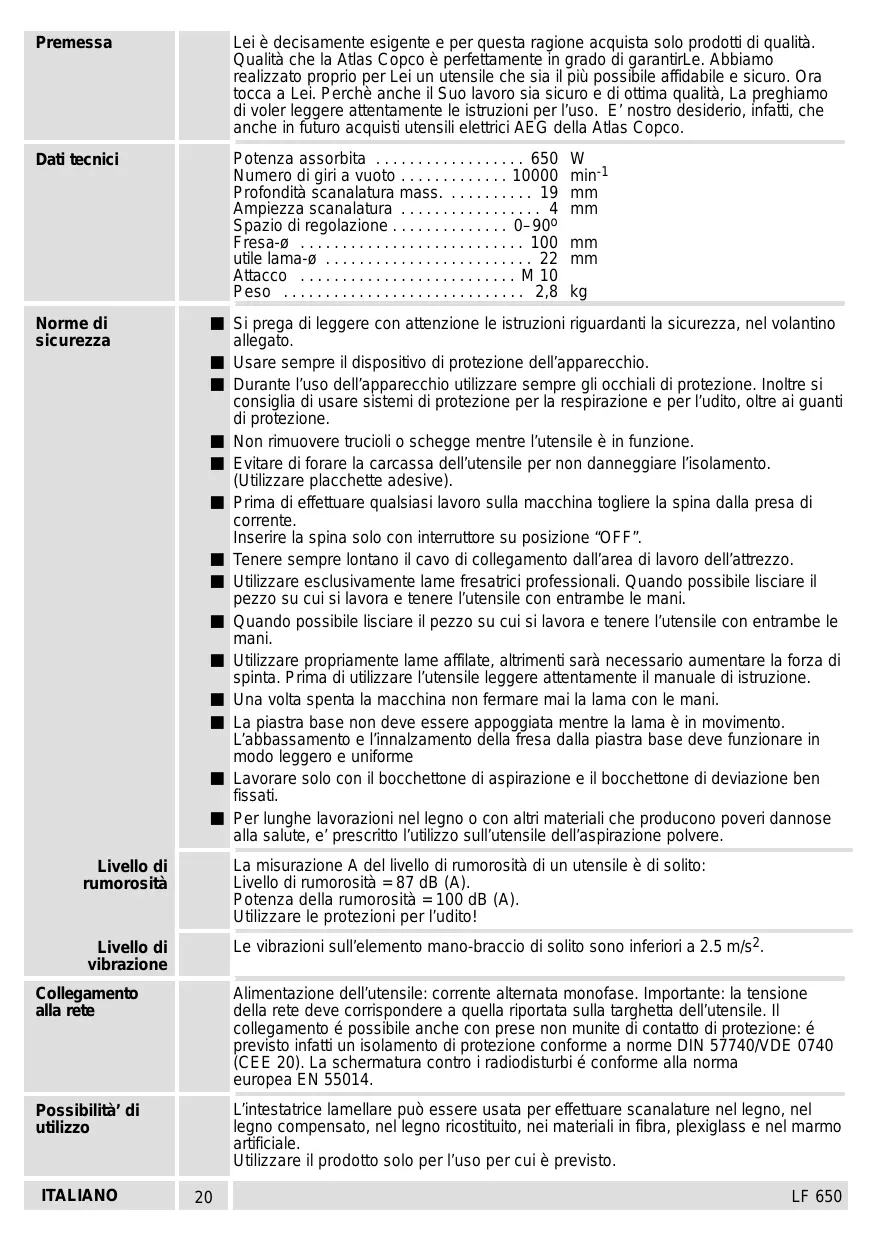 LF 650 Premessa Lei è decisamente esigente e per questa ragione acquista solo prodotti di qualità. Qualità che la Atlas Copco è perfettamente in grado di garantirLe. Abbiamo realizzato proprio per Lei un utensile che sia il più possibile affidabile e sicuro. Ora tocca a Lei. Perchè anche il Suo lavoro sia sicuro e di ottima qualità, La preghiamo di voler leggere attentamente le istruzioni per l’uso. E’ nostro desiderio, infatti, che anche in futuro acquisti utensili elettrici AEG della Atlas Copco. Dati tecnici Potenza assorbita . . . . . . . . . . . . . . . . . . 650 Numero di giri a vuoto . . . . . . . . . . . . . 10000 Profondità scanalatura mass. . . . . . . . . . . 19 Ampiezza scanalatura . . . . . . . . . . . . . . . . . 4 Spazio di regolazione . . . . . . . . . . . . . . 0–90o Fresa-ø . . . . . . . . . . . . . . . . . . . . . . . . . . . 100 utile lama-ø . . . . . . . . . . . . . . . . . . . . . . . . . 22 Attacco . . . . . . . . . . . . . . . . . . . . . . . . . . M 10 Peso . . . . . . . . . . . . . . . . . . . . . . . . . . . . . 2,8 Norme di sicurezza