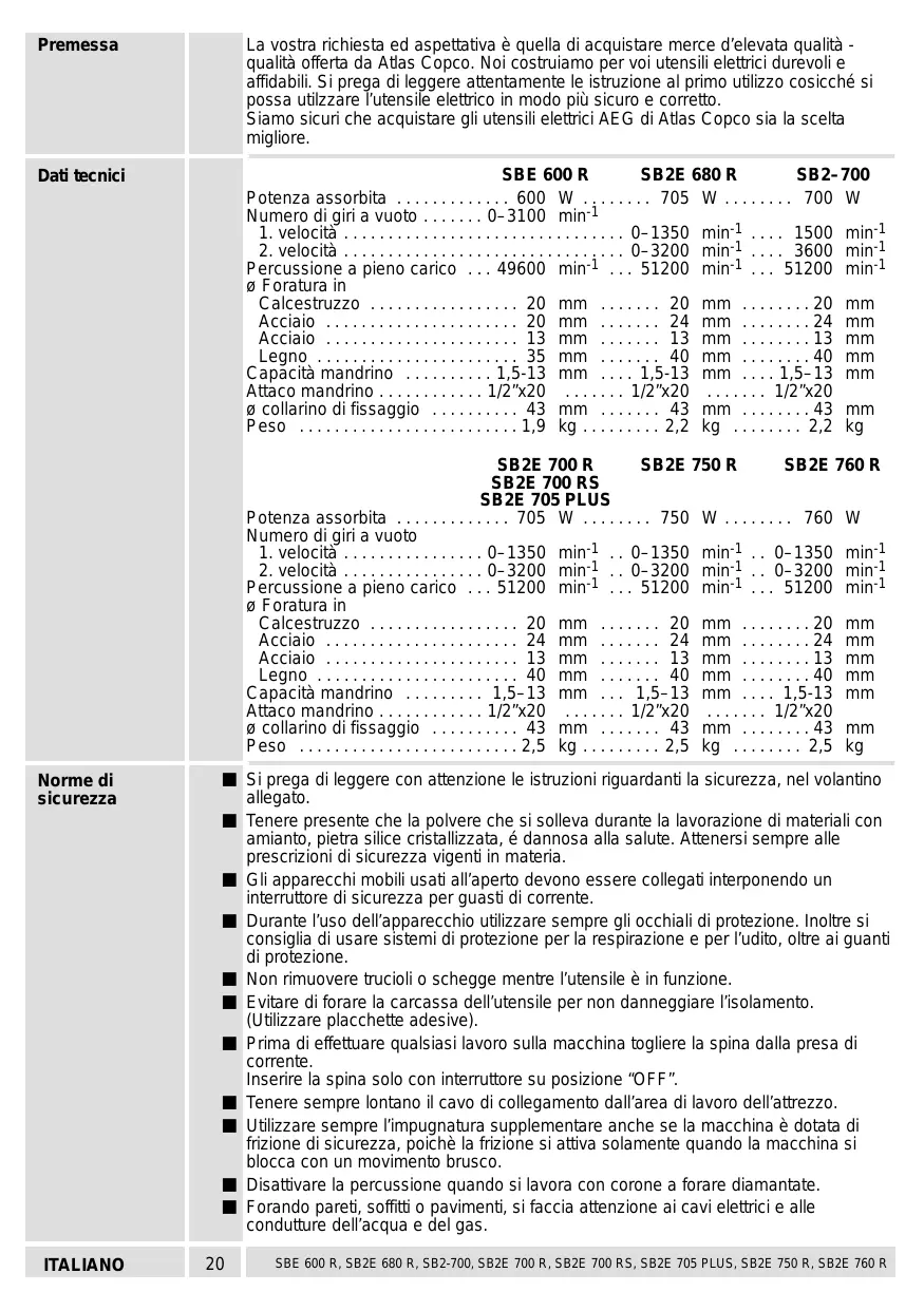 - SBE 600 R, SB2E 680 R, SB2-700, SB2E 700 R, SB2E 700 RS, SB2E 705 PLUS, SB2E 750 R, SB2E 760 R Premessa La vostra richiesta ed aspettativa è quella di acquistare merce d’elevata qualità qualità offerta da Atlas Copco. Noi costruiamo per voi utensili elettrici durevoli e affidabili. Si prega di leggere attentamente le istruzione al primo utilizzo cosicché si possa utilzzare l’utensile elettrico in modo più sicuro e corretto. Siamo sicuri che acquistare gli utensili elettrici AEG di Atlas Copco sia la scelta migliore. Dati tecnici SBE 600 R SB2E 680 R SB2–700 Potenza assorbita p. 600