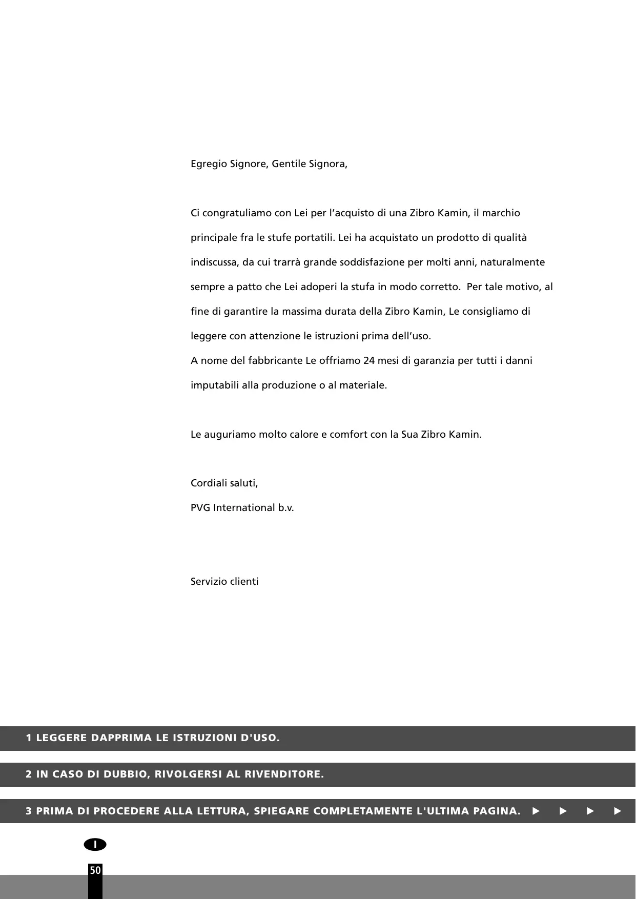 Egregio Signore, Gentile Signora, Ci congratuliamo con Lei per l’acquisto di una Zibro Kamin, il marchio principale fra le stufe portatili. Lei ha acquistato un prodotto di qualità indiscussa, da cui trarrà grande soddisfazione per molti anni, naturalmente sempre a patto che Lei adoperi la stufa in modo corretto. Per tale motivo, al fine di garantire la massima durata della Zibro Kamin, Le consigliamo di leggere con attenzione le istruzioni prima dell’uso. A nome del fabbricante Le offriamo 24 mesi di garanzia per tutti i danni imputabili alla produzione o al materiale. Le auguriamo molto calore e comfort con la Sua Zibro Kamin. Cordiali saluti, PVG International b.v. Servizio clienti 1 LEGGERE DAPPRIMA LE ISTRUZIONI D'USO. 2 IN CASO DI DUBBIO, RIVOLGERSI AL RIVENDITORE. 3 PRIMA DI PROCEDERE ALLA LETTURA, SPIEGARE COMPLETAMENTE L'ULTIMA PAGINA.