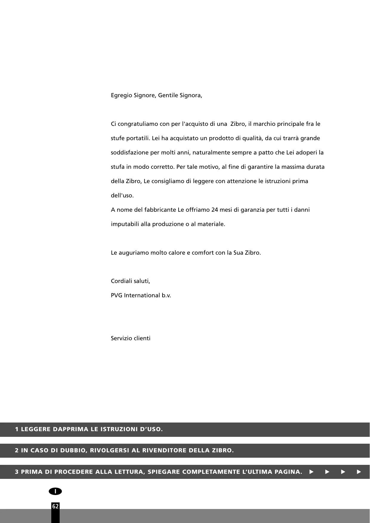Egregio Signore, Gentile Signora, Ci congratuliamo con per l'acquisto di una Zibro, il marchio principale fra le stufe portatili. Lei ha acquistato un prodotto di qualità, da cui trarrà grande soddisfazione per molti anni, naturalmente sempre a patto che Lei adoperi la stufa in modo corretto. Per tale motivo, al fine di garantire la massima durata della Zibro, Le consigliamo di leggere con attenzione le istruzioni prima dell'uso. A nome del fabbricante Le offriamo 24 mesi di garanzia per tutti i danni imputabili alla produzione o al materiale. Le auguriamo molto calore e comfort con la Sua Zibro. Cordiali saluti, PVG International b.v. Servizio clienti 1 LEGGERE DAPPRIMA LE ISTRUZIONI D’USO. 2 IN CASO DI DUBBIO, RIVOLGERSI AL RIVENDITORE DELLA ZIBRO. 3 PRIMA DI PROCEDERE ALLA LETTURA, SPIEGARE COMPLETAMENTE L’ULTIMA PAGINA.