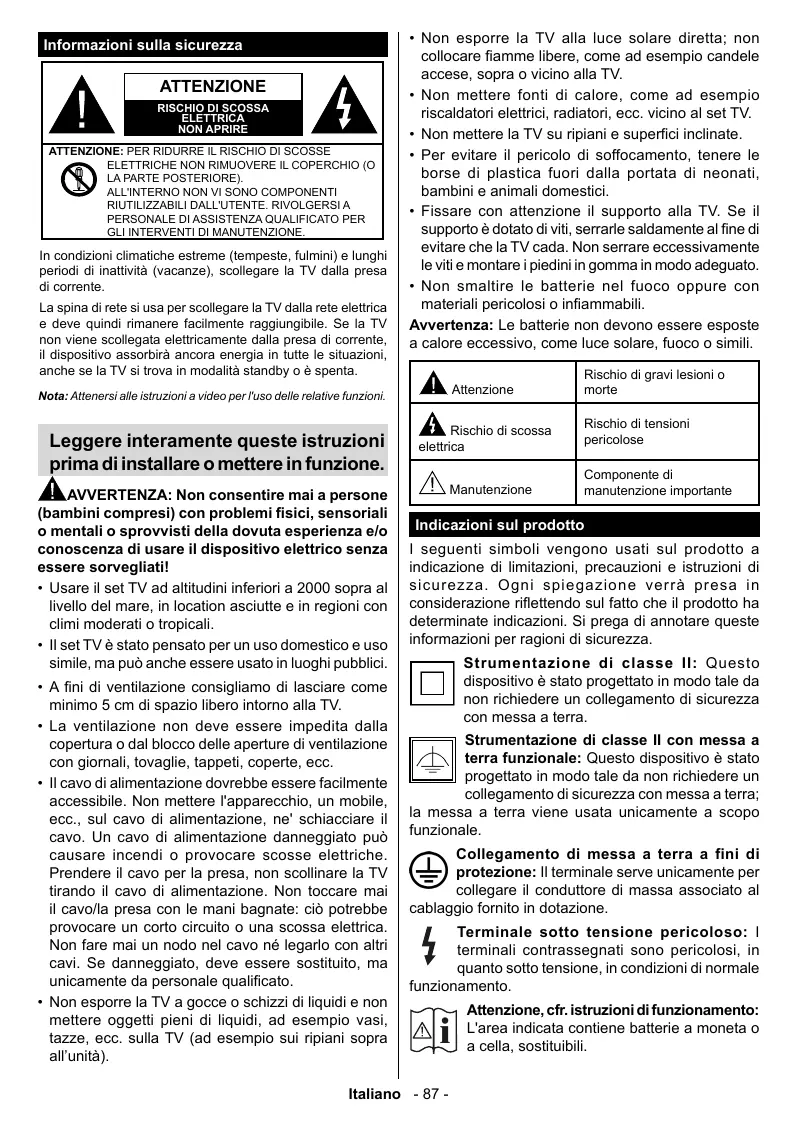 - Non smaltire le batterie nel fuoco oppure con materiali pericolosi o infiammabili. Avvertenza: Le batterie non devono essere esposte a calore eccessivo, come luce solare, fuoco o simili. Attenzione Nota: Attenersi alle istruzioni a video per l'uso delle relative funzioni. Leggere interamente queste istruzioni prima di installare o mettere in funzione. AVVERTENZA: Non consentire mai a persone (bambini compresi) con problemi fisici, sensoriali o mentali o sprovvisti della dovuta esperienza e/o conoscenza di usare il dispositivo elettrico senza essere sorvegliati!