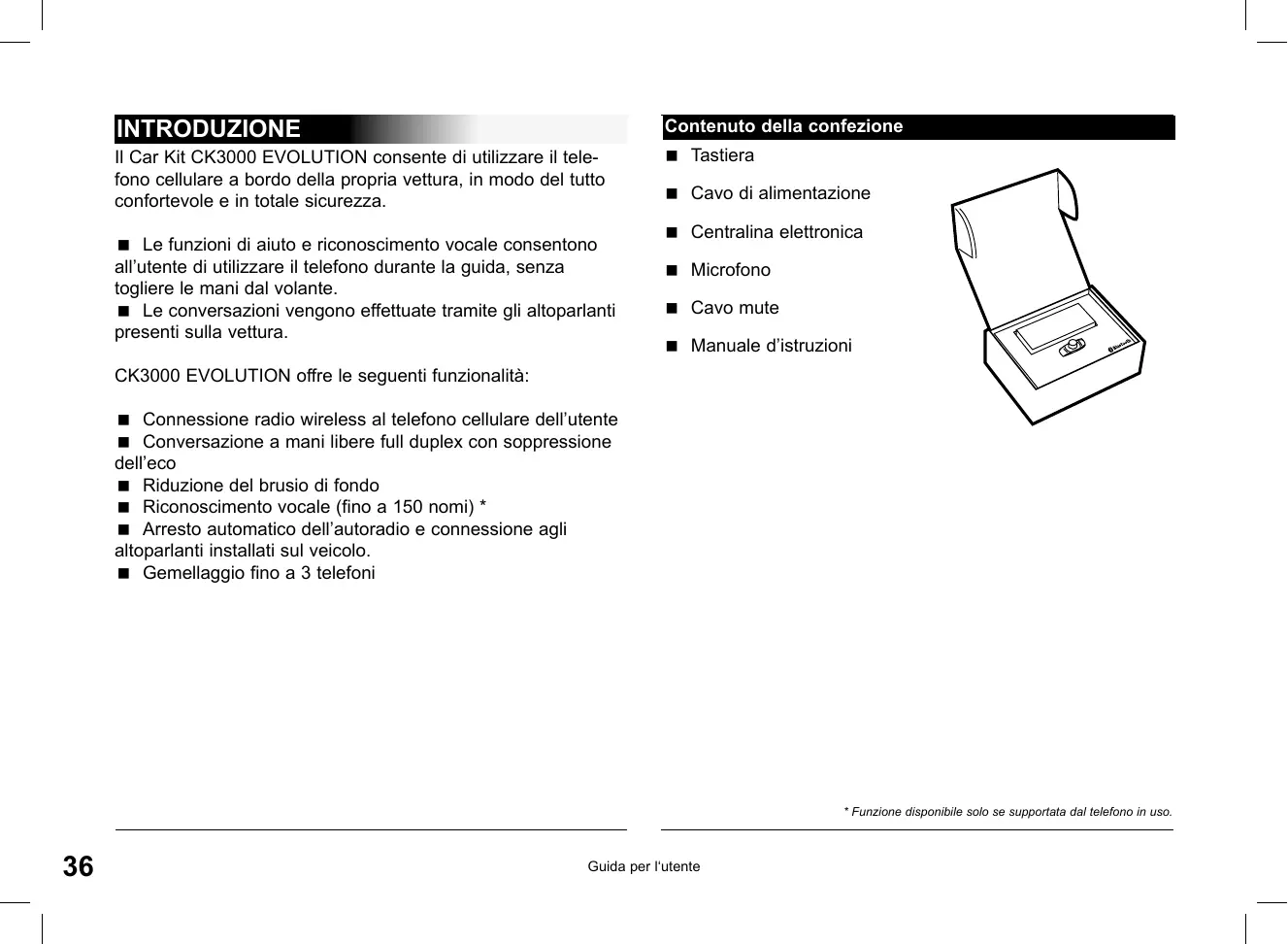Guida per l‘utente Microfono Il microfono deve essere diretto verso il conducente e installato preferibilmente tra l’aletta parasole e lo specchietto retrovisore interno. Tastiera Si consiglia di installare la tastiera in una posizione facilmente accessibile, preferibilmente su una superficie piana precedentemente pulita con cura. Attenzione Collegare la tastiera all’apposito connettore sul cavo mute. Verificare che le spie rossa e verde si accendano e spengano in base alla posizione della chiave di accensione. CK3000 EVOLUTION English Français Español Autoradio con prese ISO Scollegare i fasci dei cavi audio e di alimentazione dell’autoradio. Collegare i connettori femmina del cavo mute e del cavo di alimentazione all’autoradio. Collegare i fasci dei cavi audio e di alimentazione del veicolo ai connettori maschio Italiano Centralina elettronica Non installare la centralina vicino all’impianto di riscaldamento o al climatizzatore. Proteggere la centralina elettronica dall’esposizione diretta al sole. Evitare di chiudere o inserire la centralina tra pannelli metallici che altererebbero la qualità del collegamento Bluetooth®. Connessione del cavo mute e del cavo di alimentazione Il cavo mute è dotato di connettori ISO di colore nero. Il cavo di alimentazione è dotato di connettori ISO di colore grigio. Português Nederlands MONTAGGIO Se il CK3000 EVOLUTION viene installato da un tecnico qualificato, passare direttamente al capitolo successivo, in cui è descritta la funzione di gemellaggio. Il CK3000 EVOLUTION include una scatola di comando elettronica, un microfono, un telecomando a 2 tasti e due cavi a fascio di connessione ISO per l’autoradio.