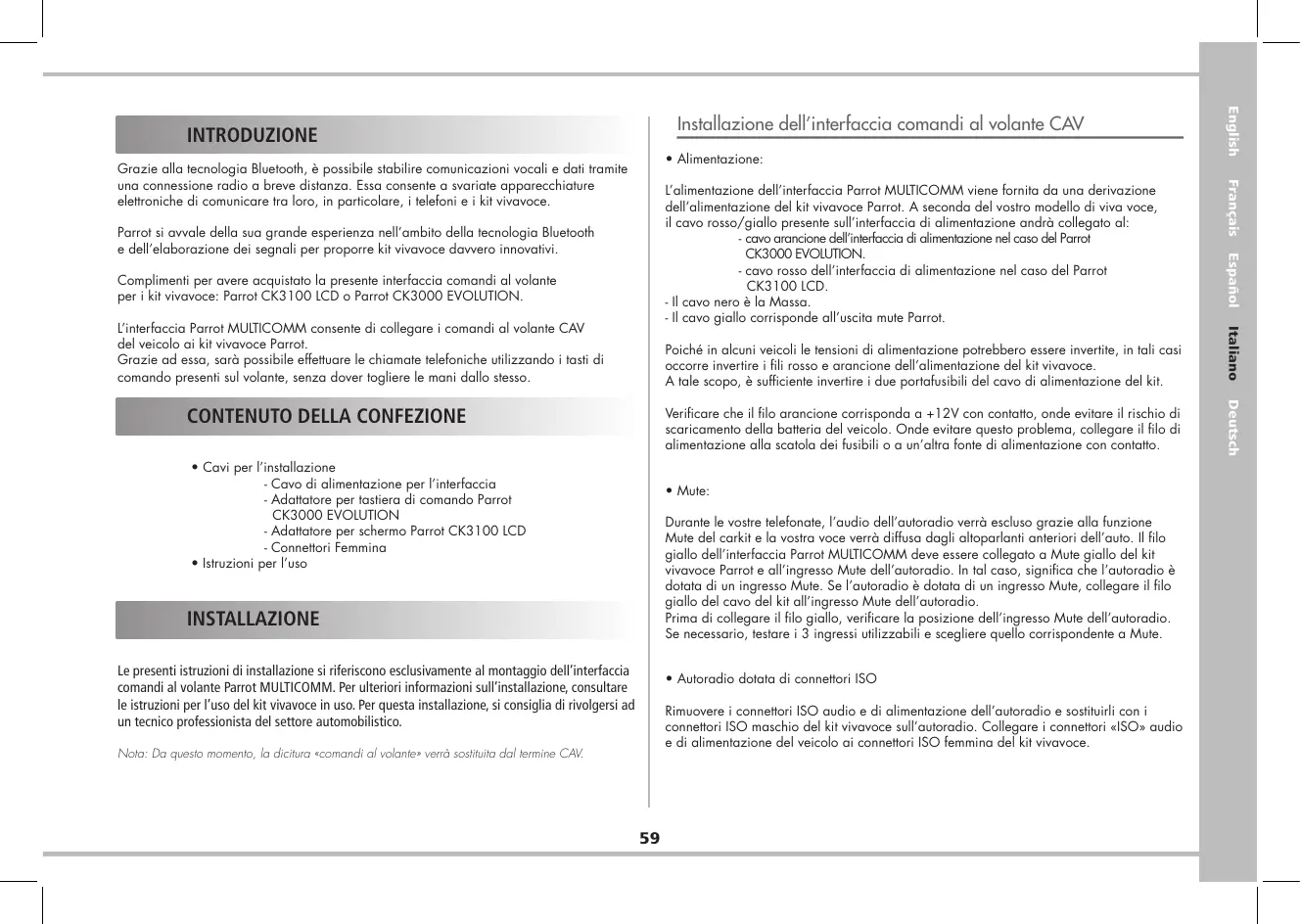Grazie alla tecnologia Bluetool, à possible stabilre comunicazioni vocali e dati iramite una connessione radio a breve distanza. Essa consente a svariale apparecchiature elettroniche di comunicare tra loro, in particolare, i telefoni e i ki vivavoce. Parrot si awvale della sua grande esperienza nell'ambito della tecnologia Bluetooth dell'elaborazione dei segnali per proporre kit vivavoce dawvero innovativi Complimenti per avere acquistalo la presente interfaccia comandi al volante per i kit vivavoce: Parrot CK3100 LCD o Parrot CK3000 EVOLUTION. L'interfaccia Parrot MULTICOMM consente di collegare i comandi al volante CAV del veicolo ai kit vivavoce Parrot. Grazie ad essa, sarè possibile eflettuare le chiamate telefoniche uilizzando i tasf di comando presenti sul volante, senza dover logliere le mani dallo stesso. + Cavi per l'installazione - Cavo di alimentazione per linterfaccia - Adaïtaïore per tastiera di comando Parrot CK3000 EVOLUTION - Adaïtatore per schermo Parrot CK3100 LCD - Connettori Femmina + Istruzioni per l'uso Le presenti istruzioni di installazione si rferiscono esclusivamente al montaggio dell'interfaccia comandi al volante Parrot MULTICOMM. Per lterior informazioni sul'installazione, consultare le istruzioni per l'uso del kit vivavoce in uso. Per questa installazione, si consiglia di rivolgersi ad un tecnico professionista del settore automobilistico. Noto: Da questo momento, la diciura «comandi al volante» verrà sostiuilo dal termine CU