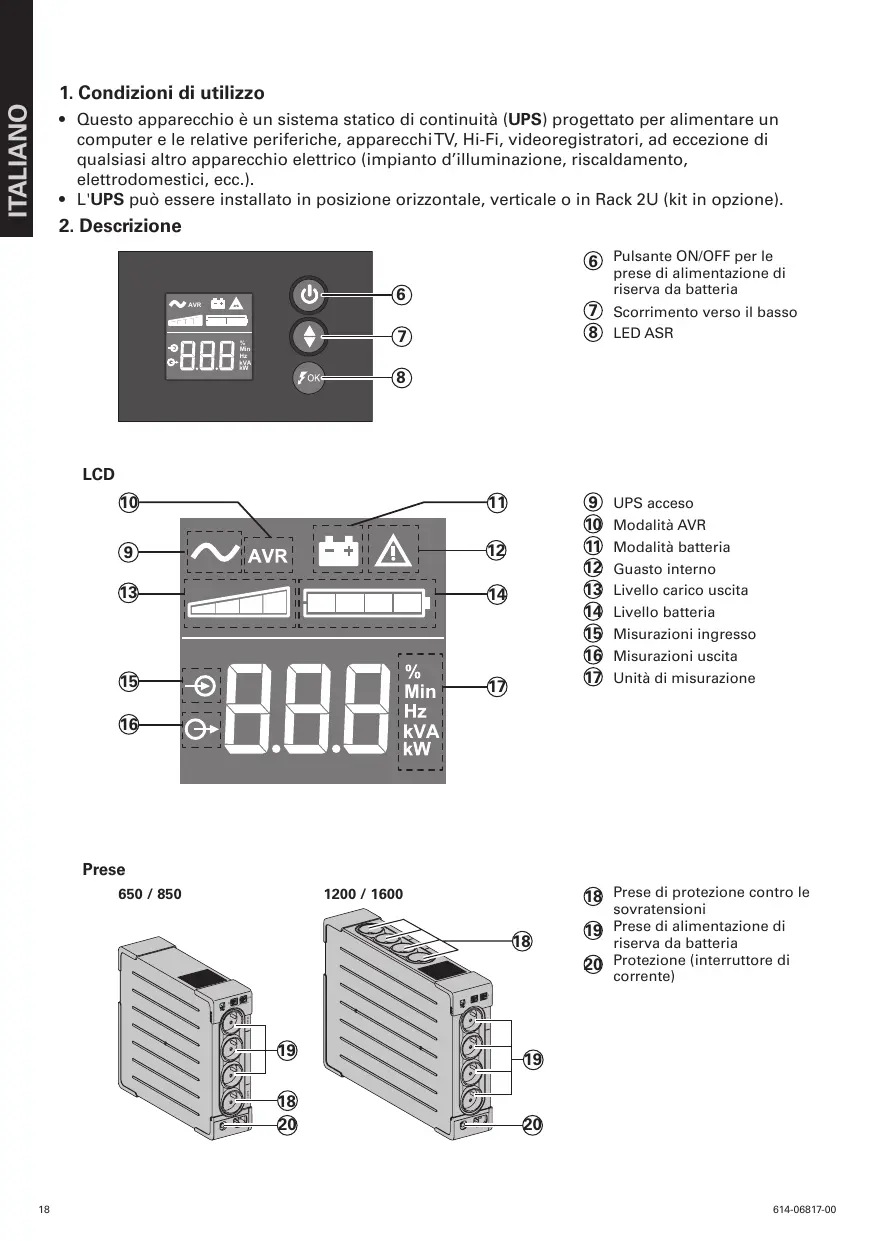 Carica della batteria l’UPS carica la batteria non appena viene collegato alla rete elettrica, indipendentemente dallo stato del tasto 6 . Al momento del primo utilizzo, la batteria fornisce un’autonomia completa solo dopo 8 ore di ricarica. Per mantenere un livello ottimale d’autonomia, si consiglia di lasciare sempre l’UPS collegato alla rete elettrica. Accensione dell’UPS Premere per 1 secondo il tasto 6 . Prese di protezione contro le sovratensioni 18 senza alimentazione di riserva da batteria Gli apparecchi collegati a queste prese vengono alimentati non appena il cavo di ingresso 4 viene collegato a una presa murale. Il tasto 6 non le comanda. Prese assistite 19 gli apparecchi collegati a queste prese vengono alimentati non appena il tasto 6 si accende in verde (vedere figura D). Queste prese possono essere messe in funzione anche se l’UPS non e collegato alla rete elettrica (tasto 6 lampeggiante).