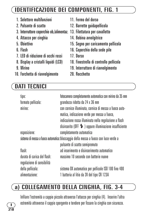 della pellicola: planta DX automatico per pellicole ISO 100 fino 400 alimentazione: 1 batteria al litio da 3V del tipo CR 123A