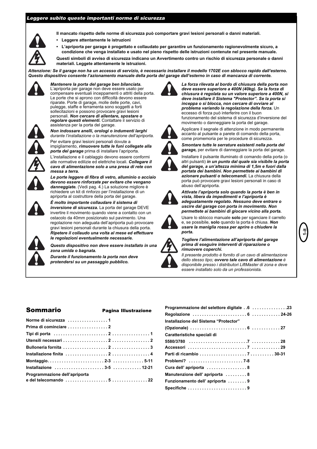 10. La porta si apre, ma non si chiude: • Controllare il sistema "Protector" (se questo accessorio è stato installato). Se la luce lampeggia, correggere l’allineamento. • Se la luce dell’apriporta non lampeggia e si tratta di una nuova installazione, controllare la forza verso il basso. Ripetere il test di sicurezza di inversione del movimento una volta effettuata la regolazione. 11. La luce dell’apriporta non si accende: Sostituire la lampadina (massimo 40W). Sostituire le lampadine bruciate con lampadine ‘heavy duty’ per prestazioni pesanti. 12. La luce dell’apriporta non si spegne: La messa a terra della presa a soffitto o a parete potrebbe essere difettosa. L’unità deve essere messa a terra. 13. L’apriporta è sotto sforzo o inverte la corsa durante l’apertura: Può darsi che la porta sia sbilanciata o che le molle siano rotte. Chiudere la porta ed usare la fune e la maniglia per lo sgancio manuale per disinnestare il carrello. Aprire e chiudere la porta manualmente. Una porta che sia ben bilanciata rimarrà in una certa posizione in qualunque punto della sua corsa, interamente sostenuta dalla sue molle. Se questo non è il caso, rivolgersi a un servizio di assistenza tecnica per porte di garage per risolvere il problema. Non cambiare le impostazioni della porta. 14. Il motore dell’apriporta ronza per un po’, ma non funziona: • Le molle della porta del garage sono rotte. SI VEDA SOPRA. • Il problema capita la prima volta che si usa l’apriporta. La porta è chiusa a chiave. Rendere inoperativa la serratura della porta. Se la catena è stata tolta e poi rimessa, può darsi che il motore sia fuori fase. Togliere la catena; portare il motore in posizione verso il basso. Osservare il rocchetto dentato di comando. Quando gira in direzione oraria e si ferma nella posizione ‘giù’, installare di nuovo la catena. Ripetere il test di sicurezza di inversione del movimento una volta che sia stata effettuata la regolazione. 15. L'apriporta non funziona per mancanza di corrente: • Tirare giù la fune e la maniglia per lo sgancio manuale per staccare il carrello. La porta può essere aperta o chiusa manualmente. Quando l'energia è rinserita, tirare giù dritto la maniglia di sgancio manuale. Quando l'apriporta sarà messo in funzione un'altra volta, il carrello si ricollegherà. • L’accessorio di sgancio rapido esterno disinserisce il carrello dall’esterno del garage nel caso che manchi la corrente. 2. Se si sta chiudendo, la porta si arresta. 3. Se si sta aprendo, la porta si arresta (lasciando spazio sufficiente per l’entrata e l’uscita di animali e il passaggio di aria fresca). 4. Se la porta viene arrestata in posizione parzialmente chiusa o aperta, inverte la direzione di movimento. 5. Se la porta incontra un ostacolo durante la chiusura, inverte il proprio moto. 6. Se la porta incontra un ostacolo durante l’apertura, la porta inverte brevemente il proprio movimento. 7. Il Protector System™ opzionale viene rilevato automaticamente e un fascio invisibile, interrotto dal passaggio di un corpo, fa sì che la porta in chiusura si riapra oppure impedisce a una porta aperta di chiudersi. Il sistema può essere bypassato solo dall’esterno. Dopo aver fatto azionare l’apriporta 5 volte di seguito, si consiglia un periodo di raffreddamento di 15 minuti. La luce dell’apriporta si accende: 1. inizialmente, quando l’apriporta è inserito; 2. quando la corrente è interrotta; 3. quando è azionato l’apriporta. La luce si spegne automaticamente dopo 2 minuti e 1/2. La lampadina deve essere al massimo di 40W.