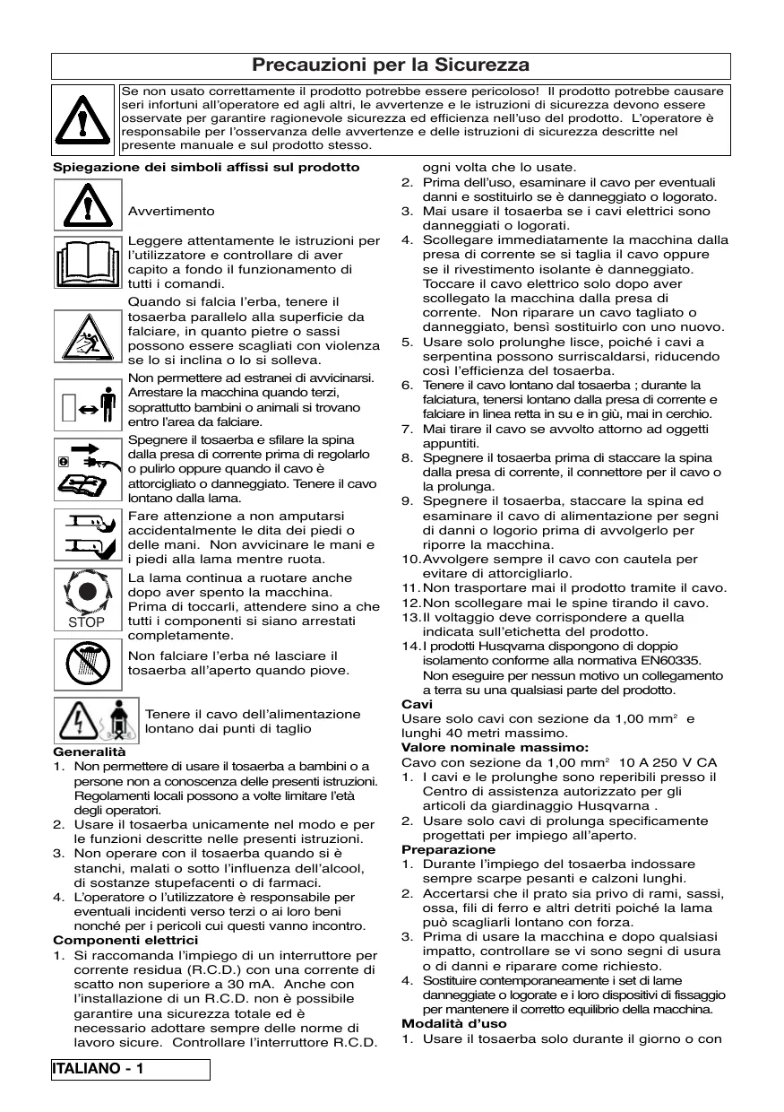 Precauzioni per la Sicurezza Se non usato correttamente il prodotto potrebbe essere pericoloso! Il prodotto potrebbe causare seri infortuni all’operatore ed agli altri, le avvertenze e le istruzioni di sicurezza devono essere osservate per garantire ragionevole sicurezza ed efficienza nell’uso del prodotto. L’operatore è responsabile per l’osservanza delle avvertenze e delle istruzioni di sicurezza descritte nel presente manuale e sul prodotto stesso. Spiegazione dei simboli affissi sul prodotto Avvertimento Leggere attentamente le istruzioni per l’utilizzatore e controllare di aver capito a fondo il funzionamento di tutti i comandi. Quando si falcia l’erba, tenere il tosaerba parallelo alla superficie da falciare, in quanto pietre o sassi possono essere scagliati con violenza se lo si inclina o lo si solleva. Non permettere ad estranei di avvicinarsi. Arrestare la macchina quando terzi, soprattutto bambini o animali si trovano entro l’area da falciare. Spegnere il tosaerba e sfilare la spina dalla presa di corrente prima di regolarlo o pulirlo oppure quando il cavo è attorcigliato o danneggiato. Tenere il cavo lontano dalla lama. Fare attenzione a non amputarsi accidentalmente le dita dei piedi o delle mani. Non avvicinare le mani e i piedi alla lama mentre ruota. STOP La lama continua a ruotare anche dopo aver spento la macchina. Prima di toccarli, attendere sino a che tutti i componenti si siano arrestati completamente. Non falciare l’erba né lasciare il tosaerba all’aperto quando piove. Tenere il cavo dell’alimentazione lontano dai punti di taglio Generalità