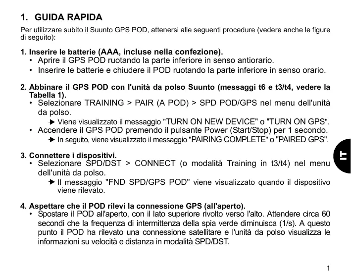 2. Abbinare il GPS POD con l'unità da polso Suunto (messaggi t6 e t3/t4, vedere la