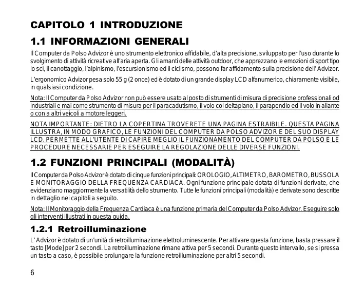Il Computer da Polso Advizor è uno strumento elettronico affidabile, d’alta precisione, sviluppato per l’uso durante lo svolgimento di attività ricreative all’aria aperta. Gli amanti delle attività outdoor, che apprezzano le emozioni di sport tipo lo sci, il canottaggio, l’alpinismo, l’escursionismo ed il ciclismo, possono far affidamento sulla precisione dell’ Advizor. L’ergonomico Advizor pesa solo 55 g (2 once) ed è dotato di un grande display LCD alfanumerico, chiaramente visibile, in qualsiasi condizione. Nota: Il Computer da Polso Advizor non può essere usato al posto di strumenti di misura di precisione professionali od industriali e mai come strumento di misura per il paracadutismo, il volo col deltaplano, il parapendio ed il volo in aliante o con a altri veicoli a motore leggeri. NOTA IMPORTANTE: DIETRO LA COPERTINA TROVERETE UNA PAGINA ESTRAIBILE. QUESTA PAGINA ILLUSTRA, IN MODO GRAFICO, LE FUNZIONI DEL COMPUTER DA POLSO ADVIZOR E DEL SUO DISPLAY LCD. PERMETTE ALL’UTENTE DI CAPIRE MEGLIO IL FUNZIONAMENTO DEL COMPUTER DA POLSO E LE PROCEDURE NECESSARIE PER ESEGUIRE LA REGOLAZIONE DELLE DIVERSE FUNZIONI.