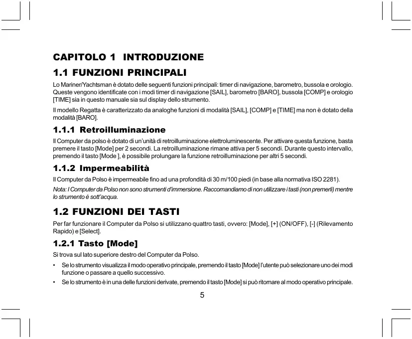 Lo MarinerfYachtsman à dotato delle seguentifunzioni principal: timer dinavigazione, baromelro, bussola € orologio. Queste vengono identiicate con i modi timer di navigazione [SAIL], baromelro [BARO], bussola [COMP] orologio [TIME] sia in questo manuale sia sul display dello strumento. !modello Regatta à caratterizzato da analoghe funzioni di modaltà [SAIL], [COMP] e [TIME] ma non dotato della modalà [BARO.