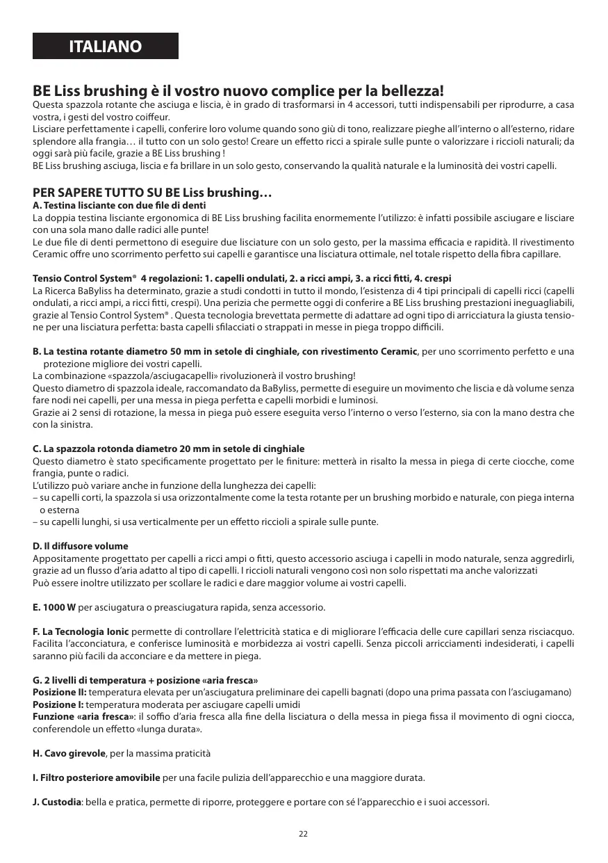 La double tête lissante ergonomique de BE Liss brushing rend son utilisation particulièrement aisée : le séchage et le lissage peuvent se faire avec une seule main de la racine aux pointes! Les deux rangées de dents permettent deux lissages en un seul geste pour plus d’efficacité et de rapidité. Leur revêtement Ceramic offre une glisse parfaite sur le cheveu et garantit un lissage optimal, dans le respect total de la fibre capillaire. Tensio Control System® 4 réglages : 1. ondulés, 2. bouclés, 3. frisés, 4. crépus La Recherche BaByliss a déterminé par de nombreuses études à travers le monde l’existence de 4 types fondamentaux de frisure (ondulé, bouclé, frisé, crépu). Son expertise permet aujourd’hui d’apporter à BE Liss brushing une performance inégalée grâce au Tensio Control System®. Cette technologie brevetée permet d’adapter à chacun des types de frisure la tension adéquate pour un lissage parfait : finis les tiraillements et les cheveux arrachés lors de brushings trop laborieux ! B. L a tête rotative diamètre 50mm en poils de sanglier, avec revêtement Ceramic pour une glisse parfaite et une meilleure protection de votre cheveu. La combinaison « brosse/sèche-cheveux » va révolutionner votre geste brushing ! Ce diamètre de brosse idéal, recommandé par BaByliss, effectue un mouvement lisse et gonflant sans emmêler les cheveux, avec le meilleur résultat de brushing pour des cheveux plein de douceur. Grâce à ses 2 sens de rotation, le brushing peut se faire vers l’intérieur ou vers l’extérieur, que vous soyez droitière ou gauchère. C. La brosse ronde diamètre 20mm en poils de sanglier Ce diamètre est plus spécialement adapté pour les finitions : elle va accentuer la mise en forme de certaines mèches comme la frange, les pointes ou la racine. Son utilisation peut aussi varier selon la longueur de cheveux : - sur cheveux courts, elle s’utilisera horizontalement comme la tête rotative pour un brushing souple et naturel, avec effet intérieur ou extérieur. - sur cheveux longs, elle s’utilisera verticalement pour un effet boucles spirales sur les pointes. D. Le diffuseur volume Spécialement conçu pour les cheveux bouclés ou frisés, cet accessoire sèche les cheveux naturellement, sans les agresser grâce à un flux d’air adapté. Les boucles naturelles sont ainsi respectées et mises en valeur. De plus, il peut s’utiliser pour décoller la racine et donner du volume à vos cheveux. E. 1000 W pour un séchage ou un pré-séchage rapide, sans accessoire. F. La Technologie Ionic permet de maîtriser l’électricité statique et aussi de renforcer l’efficacité de soins capillaires non rincés. Elle facilite le coiffage et donne de la brillance et de la douceur à vos cheveux. Sans frisottis, ils seront plus faciles à coiffer et à mettre en forme. G. 2 niveaux de températures + position « air frais » P osition II : température élevée pour le pré-séchage des cheveux mouillés (après essorage avec une serviette) P osition I : température modérée pour le séchage des cheveux humides P osition « air frais » : le coup d’air frais en fin de lissage ou de brushing fixe le mouvement de chaque mèche et lui confère un effet « longue durée » H. Cordon rotatif pour une utilisation pratique I. Filtre arrière amovible pour un entretien facile de l’appareil et prolonger sa durée de vie J. Trousse de rangement : esthétique et pratique, elle facilite le rangement, la protection et le transport de l’appareil et de ses accessoires.