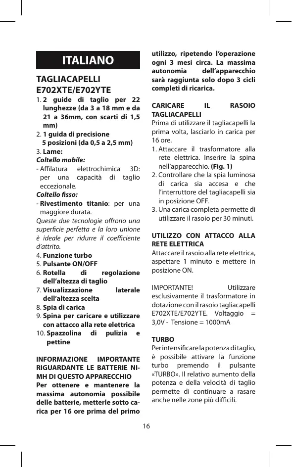 RETE ELETTRICA Attaccare il rasoio alla rete elettrica, aspettare 1 minuto e mettere in posizione ON. IMPORTANTE! Utilizzare esclusivamente il trasformatore in dotazione con il rasoio tagliacapelli E702XTE/E702YTE. Voltaggio = 3,0V - Tensione = 1000mA TURBO Per intensificare la potenza di taglio, è possibile attivare la funzione turbo premendo il pulsante «TURBO». Il relativo aumento della potenza e della velocità di taglio permette di continuare a rasare anche nelle zone più difficili. INFORMAZIONE IMPORTANTE RIGUARDANTE LE BATTERIE NIMH DI QUESTO APPARECCHIO Per ottenere e mantenere la massima autonomia possibile delle batterie, metterle sotto carica per 16 ore prima del primo