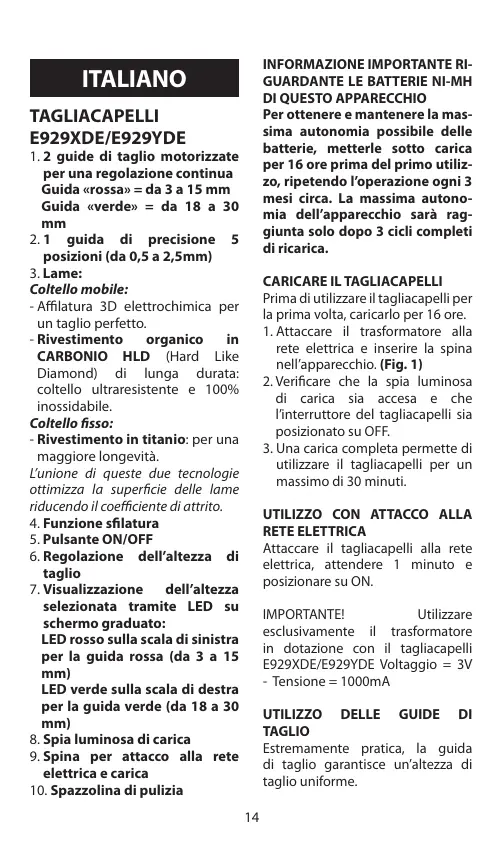 Per ottenere e mantenere la massima autonomia possibile delle batterie, metterle sotto carica per 16 ore prima del primo utilizzo, ripetendo l’operazione ogni 3 mesi circa. La massima autonomia dell’apparecchio sarà raggiunta solo dopo 3 cicli completi di ricarica. ITALIANO TAGLIACAPELLI