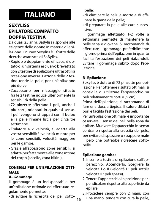 • Utiliser Sexyliss de Babyliss uniquement pour l’épilation, en respectant les indications de ce mode d’emploi. • Ne pas s’épiler sur des plaies ouvertes, des coupures, des brûlures, des verrues, des grains de beauté, sur une peau brûlée par le soleil ou sur des varices. Ne pas utiliser en cas d’irritation ou d’infections de la peau, telles que psoriasis ou eczéma sur les jambes. • Ne pas utiliser pour l’épilation du visage, des cheveux, de la poitrine, des sourcils, des cils ou des parties génitales. L’usage de Sexyliss est exclusivement réservé aux jambes, au maillot, aux bras et aux aisselles. ENTRETIEN • Passer la petite brosse entre les disques après chaque épilation. • Nous recommandons de désinfecter régulièrement les têtes de l’appareil et les accessoires à l’alcool. Ne jamais immerger l’appareil dans l’eau. • Pour une hygiène maximale, la tête d’épilation est amovible et se rince facilement sous l’eau courante. • S’il s’avère nécessaire de nettoyer la coque de l’appareil, utiliser un chiffon imbibé d’un détergent doux. CONSIGNES DE SECURITE • Utiliser exclusivement votre épilateur avec l’adaptateur et les accessoires fournis par BaByliss. • ATTENTION : les sachets en polyéthylène contenant le produit ou son emballage peuvent être dangereux. Pour prévenir les risques de suffocation,