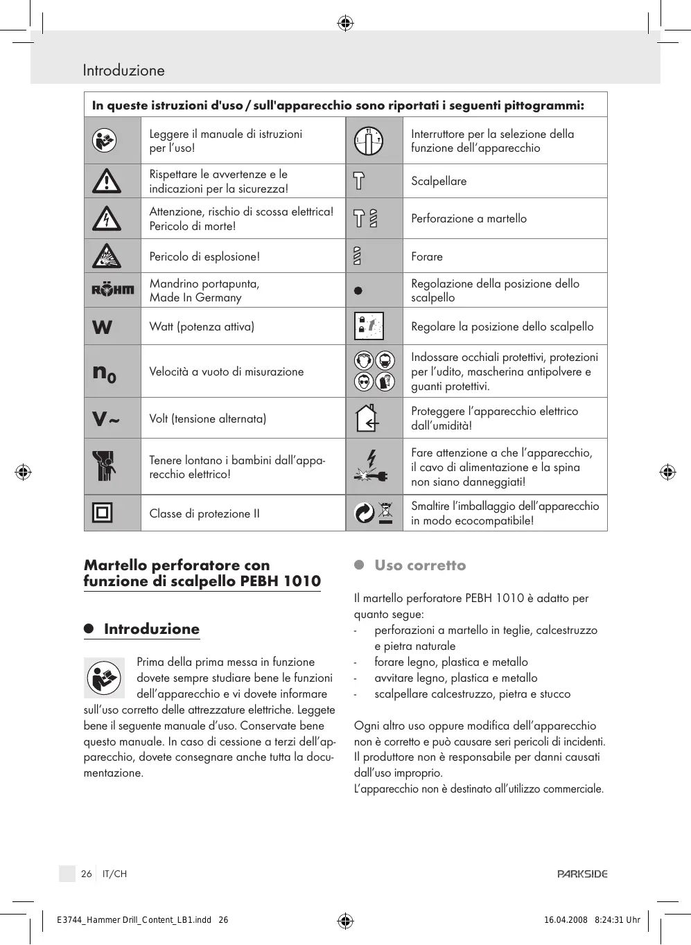Q Uso corretto Il martello perforatore PEBH 1010 è adatto per quanto segue: - perforazioni a martello in teglie, calcestruzzo e pietra naturale - forare legno, plastica e metallo - avvitare legno, plastica e metallo - scalpellare calcestruzzo, pietra e stucco Ogni altro uso oppure modifica dell’apparecchio non è corretto e può causare seri pericoli di incidenti. Il produttore non è responsabile per danni causati dall’uso improprio. L’apparecchio non è destinato all’utilizzo commerciale. IT/CH E3744_Hammer Drill_Content_LB1.indd 26