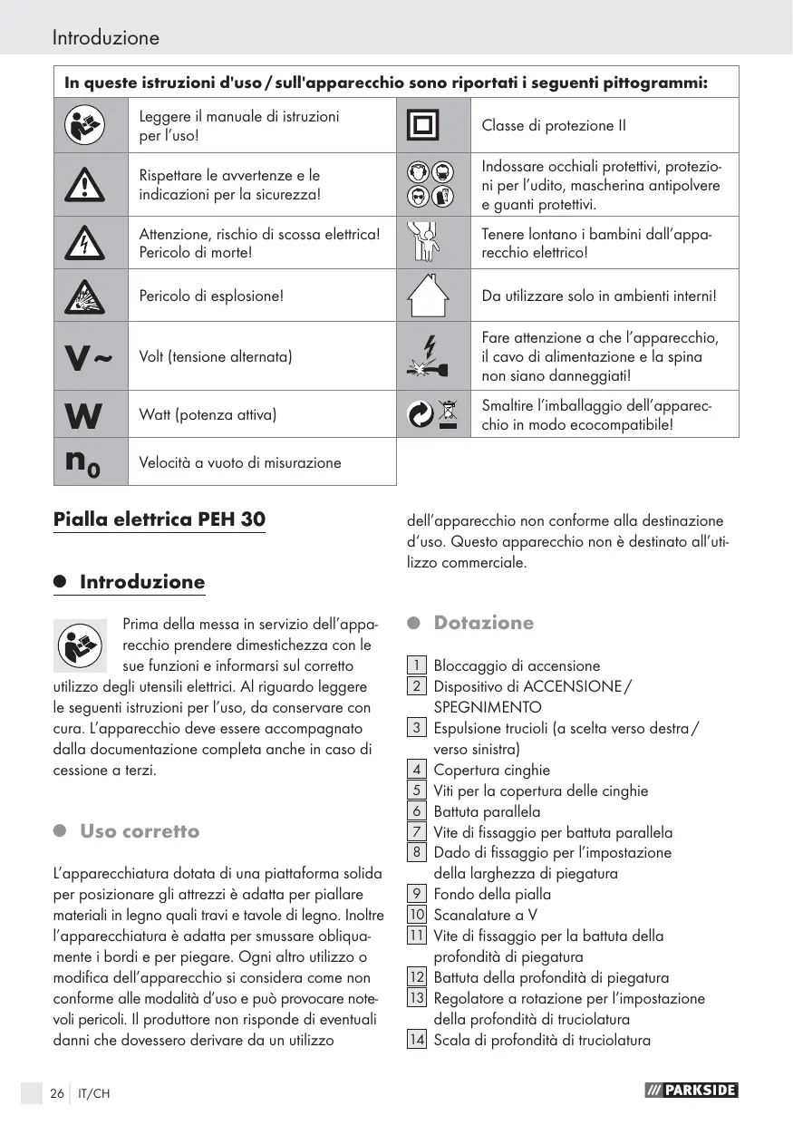 Istruzioni di sicurezza generali per utensili elettrici Pagina 27 1. Sicurezza dell’area di lavoro Pagina 2. Sicurezza elettrica Pagina 3. Sicurezza delle persone Pagina 4. Utilizzo attento di dispositivi elettriciPagina Avvisi di sicurezza particolari per quest’apparecchiatura pialla elettrica Pagina Accessori originali / apparecchiature addizionali originali Pagina