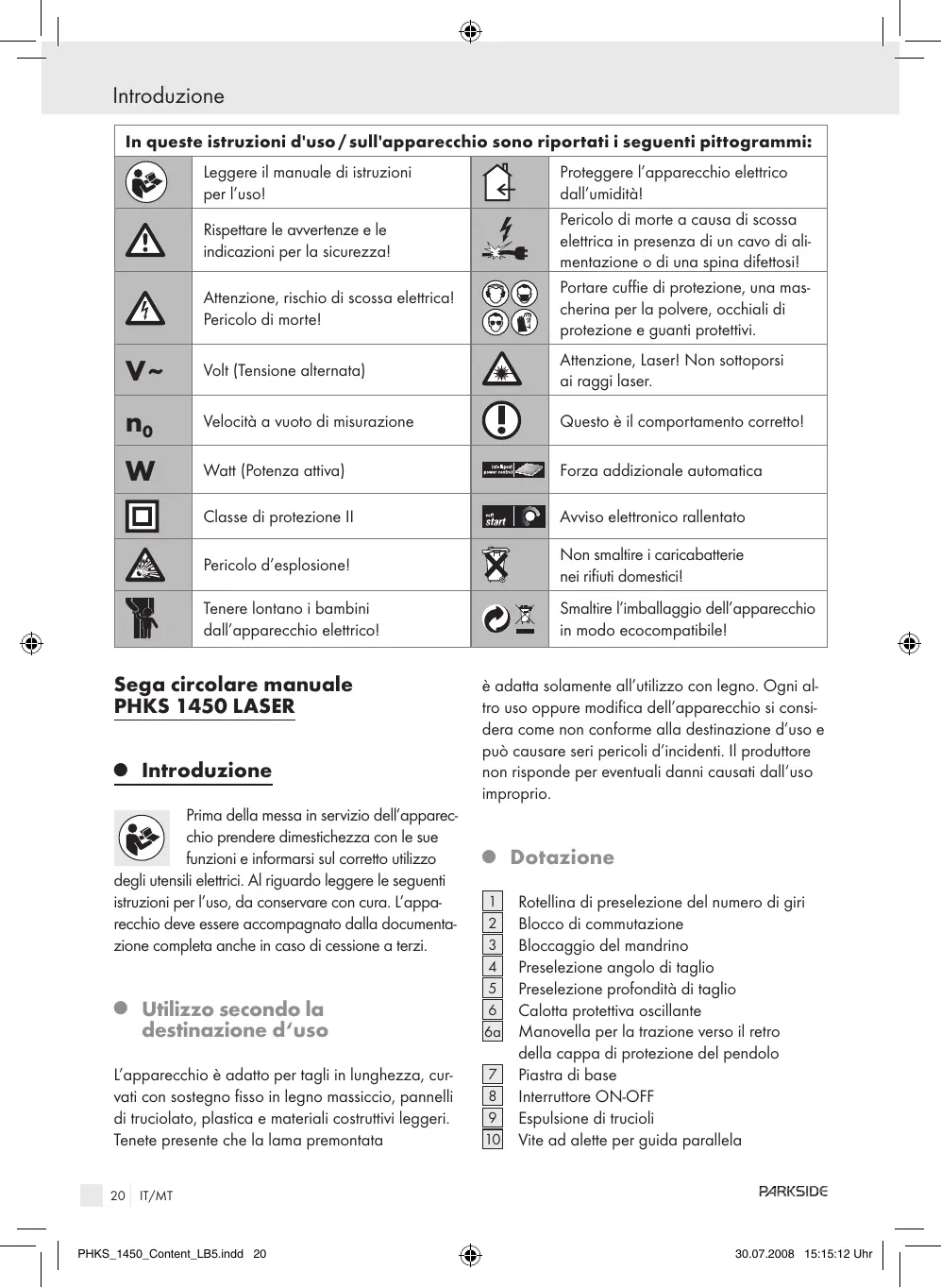In queste istruzioni d'uso / sull'apparecchio sono riportati i seguenti pittogrammi: Leggere il manuale di istruzioni per l'usol Proteggere l'apparecchio elettrico dall'umiditàl Rispettare le avvertenze e le indicazioni per la sicurezzal Pericolo di morte a causa di scossa elettrica in presenza di un cavo di ali. mentazione o di una spina difettosil Attenzione, rischio di scossa elettrical Pericolo di mortel Portare cuffie di protezione, una mas- cherina per la polvere, occhiali di protezione e guanti protetivi. Volt (Tensione alternata) Aïtenzione, Laser! Non sottoporsi ai raggi laser. LA Velocità a vuoto di misurazione Questo à il comportamento correttol W Watt (Potenza attiva) Forza addizionale automatica [OI ciosse di protezione 1 Avviso elettronico rallentato Pericolo d'esplosionel Tenere lontano i bambini dall'apparecchio elettricol x Non smalfre i caricabatterie nei rifiuti domesticil DE Smaltre limballaggio dell'apparecchio | in modo ecocompatibilel Sega circolare manuale PHKS 1450 LASER © _Introduzione chio prendere dimestichezza con le sue funzioni e informarsi sul correto utilizzo degli utensil eletrici. AI riguardo leggere le seguenti istruzioni per l'uso, da conservare con cura. L'appa- recchio deve essere accompagnato dalla documenta- Zione completa anche in caso di cessione a terzi. © Utilizzo secondo la destinazione d’uso L'apparecchio à adatto per tagli in lunghezza, cur- vati con sostegno fisso in legno massiccio, panneli di truciolato, plastica e materiali costruttivi leggeri. Tenete presente che la lama premontata 20 NT/MT | | PHKS 1450 coment LBSn88 20 è adatta solamente all'utilizzo con legno. Ogni al- tro uso oppure modifica dell'apparecchio si consi- dera come non conforme alla destinazione d'uso e pu causare seri pericoli d'incidenti. Il produttore non risponde per eventuali danni causati dall'uso improprio. Prima della messa in servizio dell'apparec- Dotazione Rotellina di preselezione del numero di giri Blocco di commutazione Bloccaggio del mandrino Preselezione angolo di taglio Preselezione profondità di taglio Calotta protettiva oscillante Manovella per la trazione verso il retro della cappa di protezione del pendolo Piastra di base Interruttore ON-OFF Espulsione di trucioli Vite ad alette per guida parallela ERLERRE