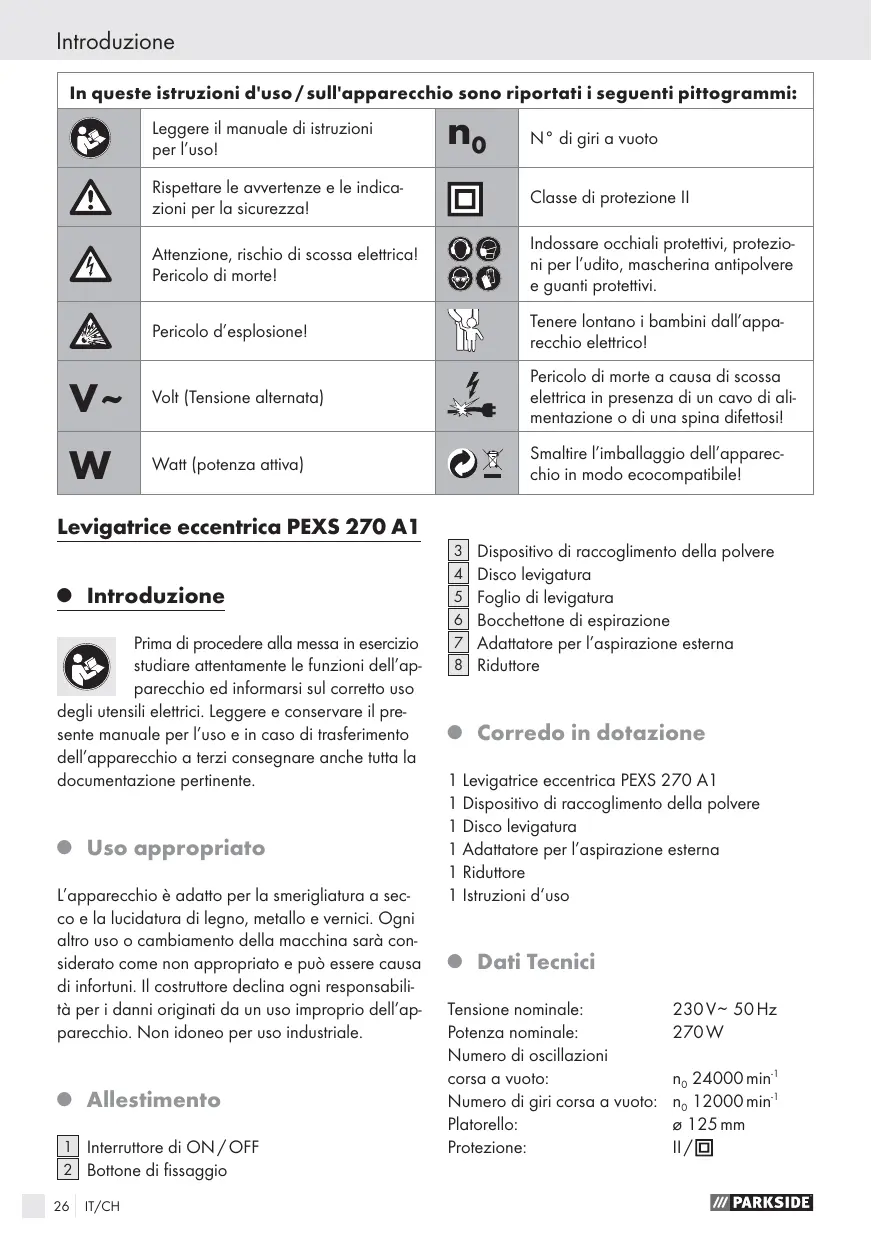 1 Levigatrice eccentrica PEXS 270 A1 1 Dispositivo di raccoglimento della polvere 1 Disco levigatura 1 Adattatore per l’aspirazione esterna 1 Riduttore 1 Istruzioni d‘uso
