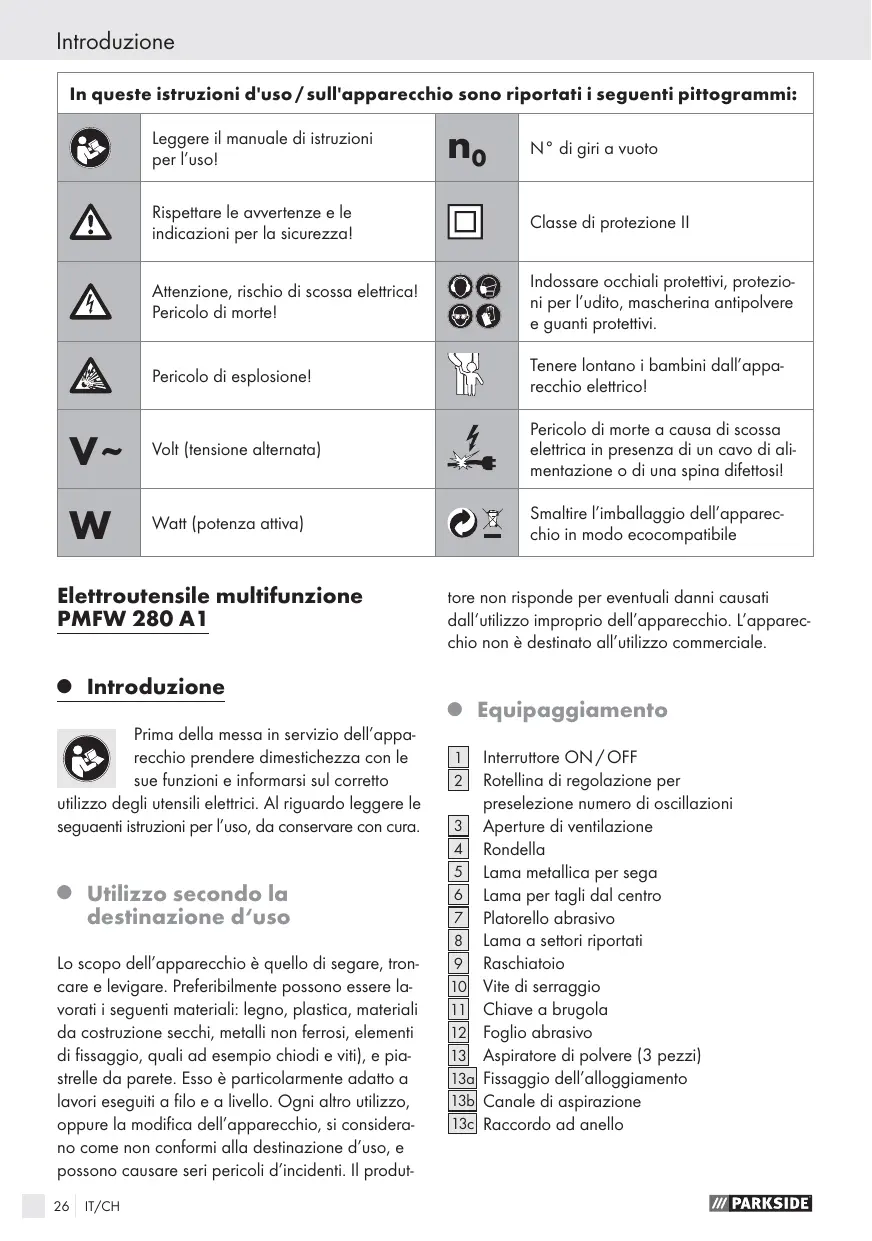 Istruzioni di sicurezza generali per utensili elettrici Pagina 27 1. Sicurezza dell’area di lavoro Pagina 2. Sicurezza elettricaPagina 3. Sicurezza delle persone Pagina 4. Utilizzo attento di dispositivi elettrici Pagina Indicazioni di sicurezza specifiche per l’attrezzo multifunzione Pagina Indicazioni relative alla lavorazione Pagina