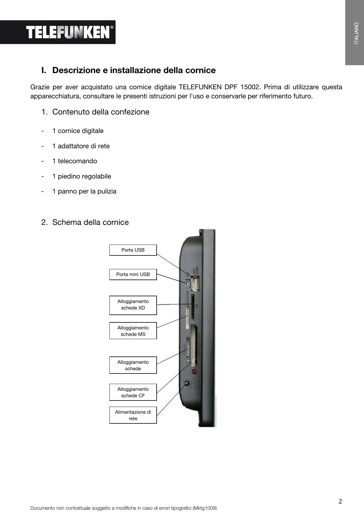 Grazie per aver acquistato una cornice digitale TELEFUNKEN DPF 15002. Prima di utilizzare esta apparecchiatura, consultare le presenti istruzioni per l'uso e conservarle per riferimento futuro.