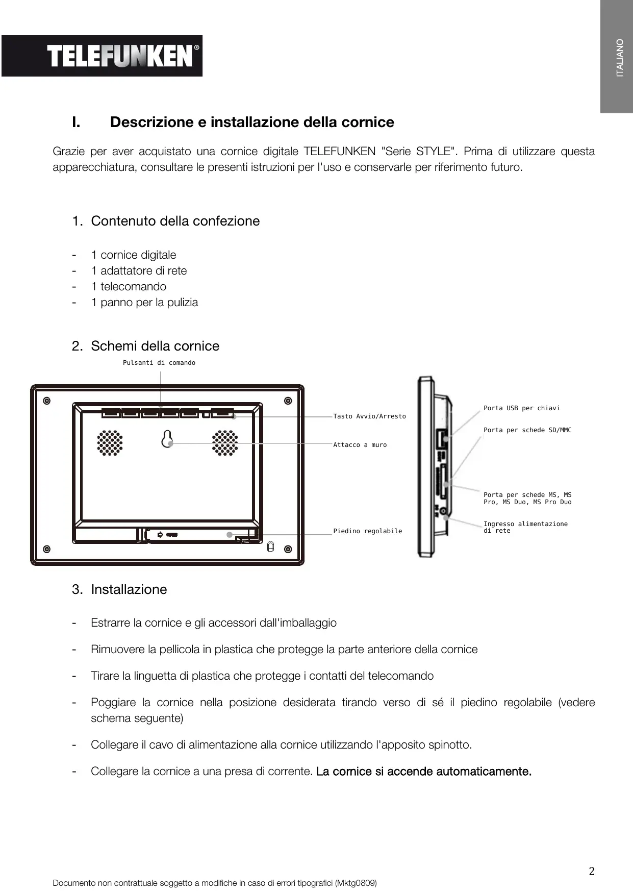 Descrizione e installazione della cornice Grazie per aver acquistato una cornice digitale TELEFUNKEN "Serie STYLE". Prima di utilizzare questa apparecchiatura, consultare le presenti istruzioni per l'uso e conservarle per riferimento futuro.