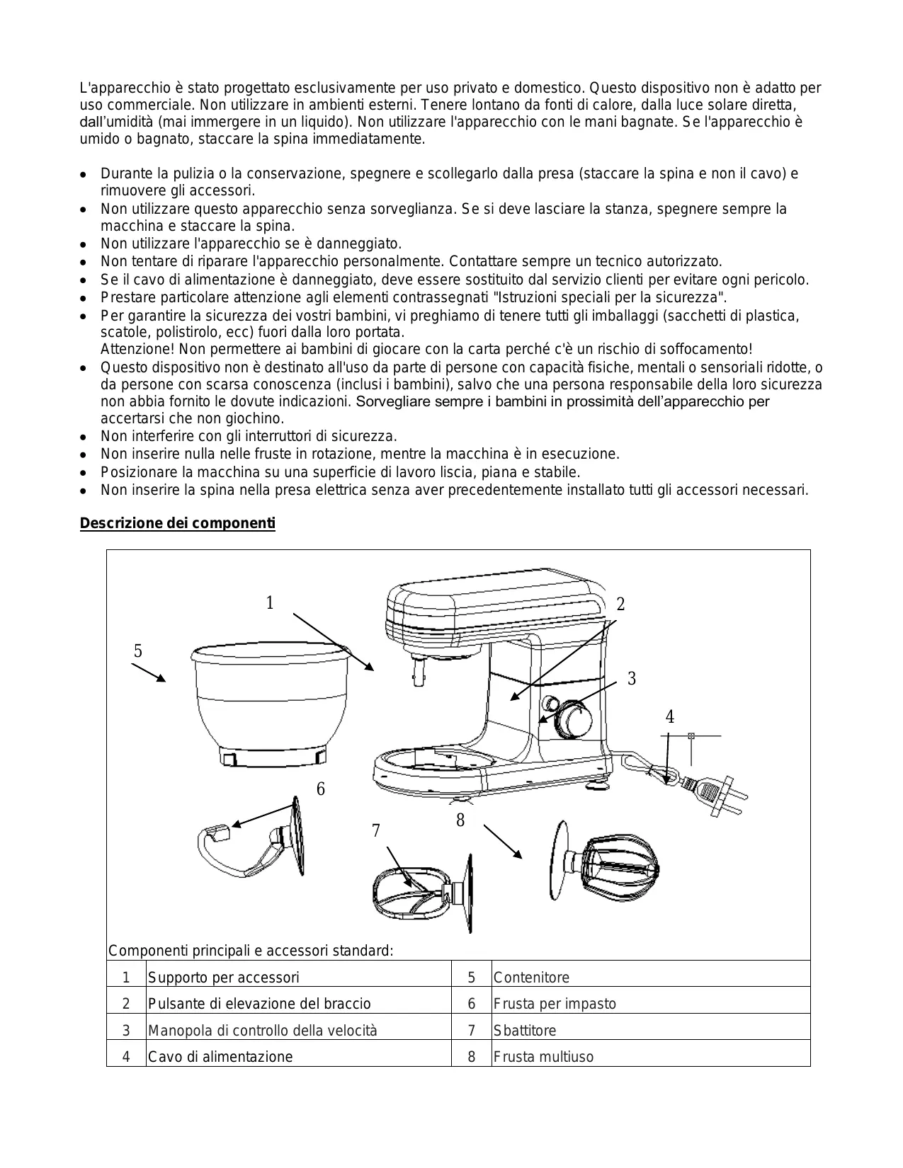 Mantenimiento / Limpieza Antes de limpiar la unidad, asegúrese de que esta esté ¡No la sumerja en agua! No utilice productos abrasivos para limpiar la unidad. desenchufada. Estructura del producto Sólo use un paño suave y húmedo para limpiar el dispositivo. Recipiente y accesorios Advertencia: - El recipiente y accesorios no deben ser colocados en el lavavajillas. - Se pueden lavar con agua y jabón o un limpiador apropiado. - Asegúrese de que las piezas estén completamente secas antes de su reutilización o almacenamiento. Medio ambiente ADVERTENCIA: No se deshaga de este producto como lo hace con otros productos del hogar. Existe un sistema selectivo de colecta de este producto puesto en marcha por las comunidades, debe de informarse en su ayuntamiento acerca de los lugares en los que puede depositar este producto. De hecho, los productos eléctricos y electrónicos pueden contener substancias peligrosas que tienen efectos nefastos para el medio ambiente o para la salud humana y deben ser reciclados. El símbolo aquí presente indica que los equipos eléctricos o electrónicos deben de ser cuidadosamente seleccionados, representa un recipiente de basura con ruedas marcado con una X. Fabricado para e importado por: Adeva European Import 8 rue Marc Seguin 77290 Mitry-Mory FRANCIA www.adeva-import.com - contact@adeva-import.com - Tél. 01 64 67 00 01 ITALIANO Modello: KM40 Tensione nominale: 220-240V ~, 50/60Hz Potenza nominale: 450W Potenza massimale : 800W Classe di protezione: II Tempo di funzionamento continuo: 6 min. Istruzioni generali sulla sicurezza Leggere attentamente le istruzioni prima di utilizzare questo apparecchio. Se possibile, conservare le istruzioni, la garanzia e la scatola con tutti gli imballaggi. Se in futuro si vorrà vendere o prestare questo apparecchio, assicurarsi di consegnare anche questo manuale. L'apparecchio è stato progettato esclusivamente per uso privato e domestico. Questo dispositivo non è adatto per uso commerciale. Non utilizzare in ambienti esterni. Tenere lontano da fonti di calore, dalla luce solare diretta, dall’umidità (mai immergere in un liquido). Non utilizzare l'apparecchio con le mani bagnate. Se l'apparecchio è umido o bagnato, staccare la spina immediatamente. Durante la pulizia o la conservazione, spegnere e scollegarlo dalla presa (staccare la spina e non il cavo) e rimuovere gli accessori. Non utilizzare questo apparecchio senza sorveglianza. Se si deve lasciare la stanza, spegnere sempre la macchina e staccare la spina. Non utilizzare l'apparecchio se è danneggiato. Non tentare di riparare l'apparecchio personalmente. Contattare sempre un tecnico autorizzato. Se il cavo di alimentazione è danneggiato, deve essere sostituito dal servizio clienti per evitare ogni pericolo. Prestare particolare attenzione agli elementi contrassegnati "Istruzioni speciali per la sicurezza". Per garantire la sicurezza dei vostri bambini, vi preghiamo di tenere tutti gli imballaggi (sacchetti di plastica, scatole, polistirolo, ecc) fuori dalla loro portata. Attenzione! Non permettere ai bambini di giocare con la carta perché c'è un rischio di soffocamento! Questo dispositivo non è destinato all'uso da parte di persone con capacità fisiche, mentali o sensoriali ridotte, o da persone con scarsa conoscenza (inclusi i bambini), salvo che una persona responsabile della loro sicurezza non abbia fornito le dovute indicazioni. Sorvegliare sempre i bambini in prossimità dell’apparecchio per accertarsi che non giochino. Non interferire con gli interruttori di sicurezza. Non inserire nulla nelle fruste in rotazione, mentre la macchina è in esecuzione. Posizionare la macchina su una superficie di lavoro liscia, piana e stabile. Non inserire la spina nella presa elettrica senza aver precedentemente installato tutti gli accessori necessari. Descrizione dei componenti