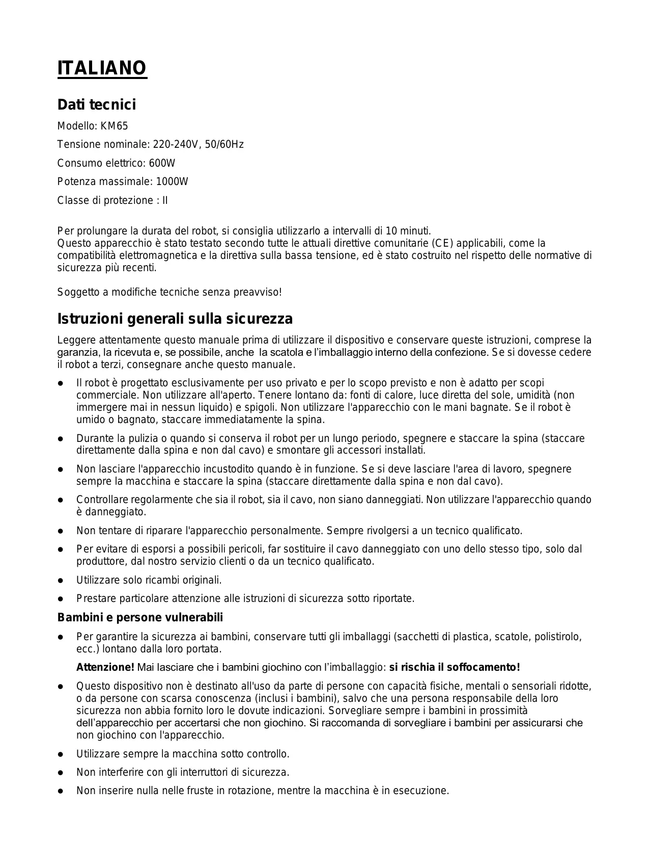 Il robot è progettato esclusivamente per uso privato e per lo scopo previsto e non è adatto per scopi commerciale. Non utilizzare all'aperto. Tenere lontano da: fonti di calore, luce diretta del sole, umidità (non immergere mai in nessun liquido) e spigoli. Non utilizzare l'apparecchio con le mani bagnate. Se il robot è umido o bagnato, staccare immediatamente la spina.
