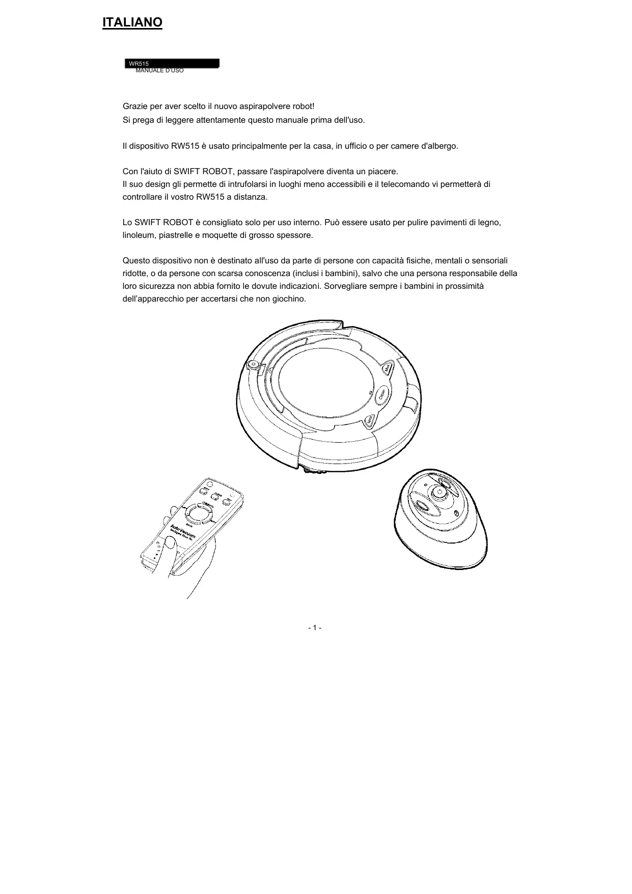 Grazie per aver scelto il nuovo aspirapolvere robot! Si prega di leggere attentamente questo manuale prima dell'uso. Il dispositivo RW515 è usato principalmente per la casa, in ufficio o per camere d'albergo. Con l'aiuto di SWIFT ROBOT, passare l'aspirapolvere diventa un piacere. Il suo design gli permette di intrufolarsi in luoghi meno accessibili e il telecomando vi permetterà di controllare il vostro RW515 a distanza. Lo SWIFT ROBOT è consigliato solo per uso interno. Può essere usato per pulire pavimenti di legno, linoleum, piastrelle e moquette di grosso spessore. Questo dispositivo non è destinato all'uso da parte di persone con capacità fisiche, mentali o sensoriali ridotte, o da persone con scarsa conoscenza (inclusi i bambini), salvo che una persona responsabile della loro sicurezza non abbia fornito le dovute indicazioni. Sorvegliare sempre i bambini in prossimità dell’apparecchio per accertarsi che non giochino.