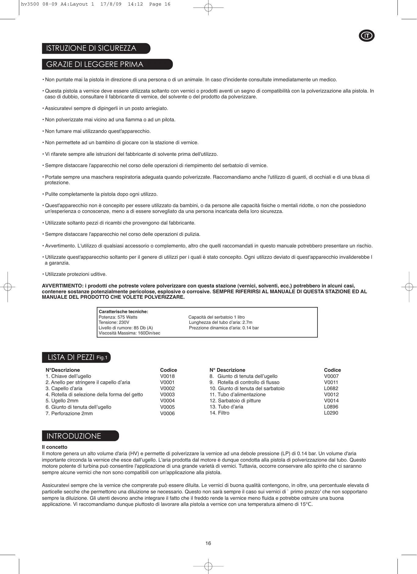 Codice V0007 V0011 L0682 V0012 V0014 L0896 L0290 INTRODUZIONE Il concetto Il motore genera un alto volume d'aria (HV) e permette di polverizzare la vernice ad una debole pressione (LP) di 0.14 bar. Un volume d'aria importante circonda la vernice che esce dall’ugello. L'aria prodotta dal motore è dunque condotta alla pistola di polverizzazione dal tubo. Questo motore potente di turbina può consentire l'applicazione di una grande varietà di vernici. Tuttavia, occorre conservare allo spirito che ci saranno sempre alcune vernici che non sono compatibili con un'applicazione alla pistola. Assicuratevi sempre che la vernice che comprerate può essere diluita. Le vernici di buona qualità contengono, in oltre, una percentuale elevata di particelle secche che permettono una diluizione se necessario. Questo non sarà sempre il caso sui vernici di ` primo prezzo' che non sopportano sempre la diluizione. Gli utenti devono anche integrare il fatto che il freddo rende la vernice meno fluida e potrebbe ostruire una buona applicazione. Vi raccomandiamo dunque piuttosto di lavorare alla pistola a vernice con una temperatura almeno di 15°С.