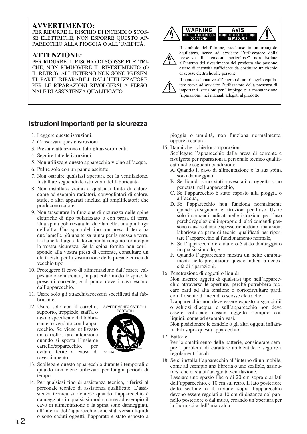 It-2 Leggere queste istruzioni. Conservare queste istruzioni. Prestare attenzione a tutti gli avvertimenti. Seguire tutte le istruzioni. Non utilizzare questo apparecchio vicino all’acqua. Pulire solo con un panno asciutto. Non ostruire qualsiasi apertura per la ventilazione. Installare seguendo le istruzioni del fabbricante. Non installare vicino a qualsiasi fonte di calore, come ad esempio radiatori, convogliatori di calore, stufe, o altri apparati (inclusi gli amplificatori) che producono calore. Non trascurare la funzione di sicurezza delle spine elettriche di tipo polarizzato o con presa di terra. Una spina polarizzata ha due lamelle, una più larga dell’altra. Una spina del tipo con presa di terra ha due lamelle più una terza punta per la messa a terra. La lamella larga o la terza punta vengono fornite per la vostra sicurezza. Se la spina fornita non corrisponde alla vostra presa di corrente, consultare un elettricista per la sostituzione della presa elettrica di vecchio tipo. Proteggere il cavo di alimentazione dall’essere calpestato o schiacciato, in particolar modo le spine, le prese di corrente, e il punto dove i cavi escono dall’apparecchio. Usare solo gli attacchi/accessori specificati dal fabbricante. Usare solo con il carrello, AVVERTIMENTO CARRELLI PORTATILI supporto, treppiede, staffa, o tavolo specificato dal fabbricante, o venduto con l’apparecchio. Se viene utilizzato un carrello, fare attenzione quando si sposta l’insieme carrello/apparecchio, per evitare ferite a causa di S3125A rovesciamento. Scollegare questo apparecchio durante i temporali o quando non viene utilizzato per lunghi periodi di tempo. Per qualsiasi tipo di assistenza tecnica, riferirsi al personale tecnico di assistenza qualificato. L’assistenza tecnica si richiede quando l’apparecchio è danneggiato in qualsiasi modo, come ad esempio il cavo di alimentazione o la spina sono danneggiati, all’interno dell’apparecchio sono stati versati liquidi o sono caduti oggetti, l’apparato è stato esposto a