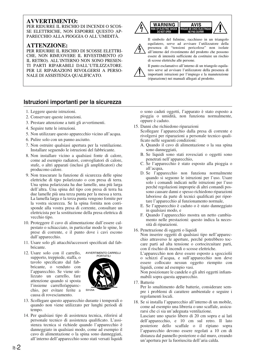 It-2 Leggere queste istruzioni. Conservare queste istruzioni. Prestare attenzione a tutti gli avvertimenti. Seguire tutte le istruzioni. Non utilizzare questo apparecchio vicino all’acqua. Pulire solo con un panno asciutto. Non ostruire qualsiasi apertura per la ventilazione. Installare seguendo le istruzioni del fabbricante. Non installare vicino a qualsiasi fonte di calore, come ad esempio radiatori, convogliatori di calore, stufe, o altri apparati (inclusi gli amplificatori) che producono calore. Non trascurare la funzione di sicurezza delle spine elettriche di tipo polarizzato o con presa di terra. Una spina polarizzata ha due lamelle, una più larga dell’altra. Una spina del tipo con presa di terra ha due lamelle più una terza punta per la messa a terra. La lamella larga o la terza punta vengono fornite per la vostra sicurezza. Se la spina fornita non corrisponde alla vostra presa di corrente, consultare un elettricista per la sostituzione della presa elettrica di vecchio tipo. Proteggere il cavo di alimentazione dall’essere calpestato o schiacciato, in particolar modo le spine, le prese di corrente, e il punto dove i cavi escono dall’apparecchio. Usare solo gli attacchi/accessori specificati dal fabbricante. Usare solo con il carrello, AVVERTIMENTO CARRELLI PORTATILI supporto, treppiede, staffa, o tavolo specificato dal fabbricante, o venduto con l’apparecchio. Se viene utilizzato un carrello, fare attenzione quando si sposta l’insieme carrello/apparecchio, per evitare ferite a S3125A causa di rovesciamento. Scollegare questo apparecchio durante i temporali o quando non viene utilizzato per lunghi periodi di tempo. Per qualsiasi tipo di assistenza tecnica, riferirsi al personale tecnico di assistenza qualificato. L’assistenza tecnica si richiede quando l’apparecchio è danneggiato in qualsiasi modo, come ad esempio il cavo di alimentazione o la spina sono danneggiati, all’interno dell’apparecchio sono stati versati liquidi