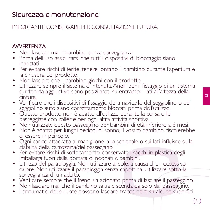 • Pour éviter toute blessure, maintenir votre enfant à l’écart lors du dépliage et du pliage du produit. • Ne pas laisser votre enfant jouer avec ce produit. • Toujours utiliser le système de retenue. Des anneaux pour la fixation d’un harnais supplémentaire sont situés au niveau de la ceinture de maintien, de chaque côté. • Vérifier que les dispositifs de fixation de la nacelle, du siège ou du siège-auto sont correctement enclenchés avant utilisation. • Ne pas utiliser ce produit en faisant du jogging ou des promenades en rollers et toutes autres activités sportives. • Ne pas utiliser ce siège pour des enfants de moins de 6 mois. • Ne convient pas pour de longue période de sommeil, votre enfant risquerait d’être en danger. • Le fait d’accrocher une charge au poussoir, dossier ou côtés influe sur la stabilité du landau/de la poussette. • Pour éviter les risques d’étouffement, conservez les sacs plastique de l’emballage hors de portée des bébés et des jeunes enfants. • Utilisation de l’habillage-pluie: Ne pas utiliser en cas de temps ensoleillé, pour cause de chaleur excessive. Ne pas utiliser l’habillage pluie sans la capote. A utiliser sous la surveillance d’un adulte. • Toujours vérifier que le frein est bien engagé avant de lâcher votre poussette. • Ne jamais laisser votre enfant monter et descendre seul de la poussette. • Les pneus peuvent laisser des traces noires sur certains sols (surtout les sols lisses comme les parquets, les laminés synthétiques, le linoléum, etc.). 19