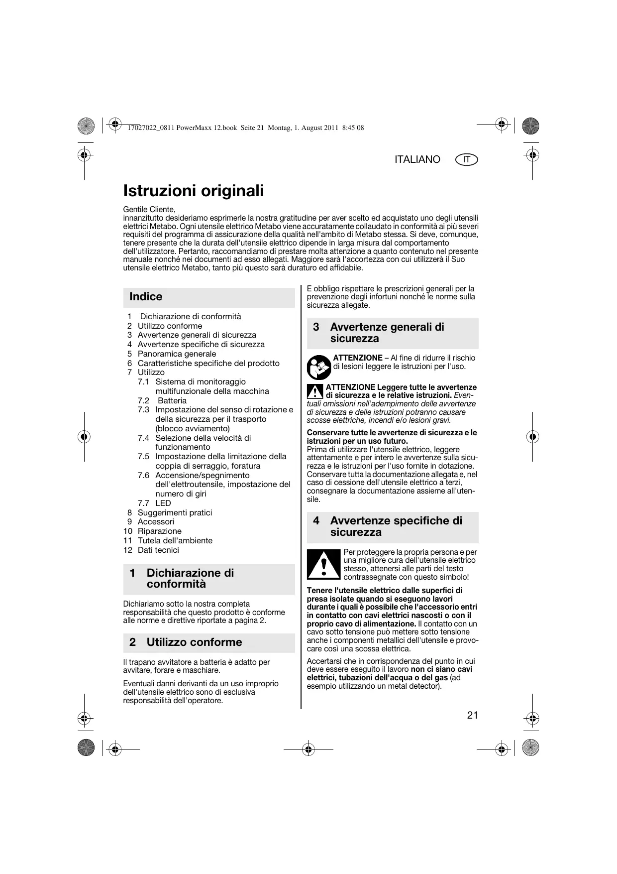 ITALIANO IT Istruzioni originali Gentile Cliente, innanzitutto desideriamo esprimerle la nostra gratitudine per aver scelto ed acquistato uno degli utensili elettrici Metabo. Ogni utensile elettrico Metabo viene accuratamente collaudato in conformità ai più severi requisiti del programma di assicurazione della qualità nell'ambito di Metabo stessa. Si deve, comunque, tenere presente che la durata dell'utensile elettrico dipende in larga misura dal comportamento dell'utilizzatore. Pertanto, raccomandiamo di prestare molta attenzione a quanto contenuto nel presente manuale nonché nei documenti ad esso allegati. Maggiore sarà l'accortezza con cui utilizzerà il Suo utensile elettrico Metabo, tanto più questo sarà duraturo ed affidabile.