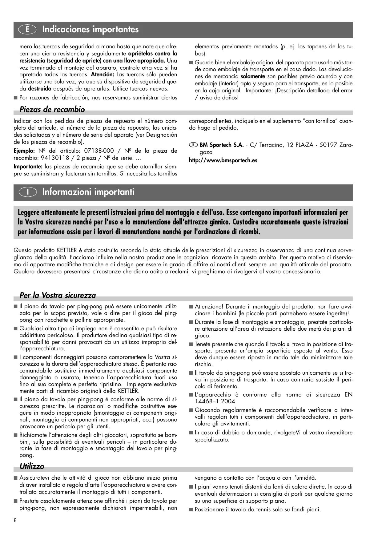 zato per lo scopo previsto, vale a dire per il gioco del pingpong con racchette e palline appropriate. Qualsiasi altro tipo di impiego non è consentito e può risultare addirittura pericoloso. Il produttore declina qualsiasi tipo di responsabilità per danni provocati da un utilizzo improprio dell’apparecchiatura. I componenti danneggiati possono compromettere la Vostra sicurezza e la durata dell’apparecchiatura stessa. È pertanto raccomandabile sostituire immediatamente qualsiasi componente danneggiato o usurato, tenendo l’apparecchiatura fuori uso fino al suo completo e perfetto ripristino. Impiegate esclusivamente parti di ricambio originali della KETTLER. Il piano da tavolo per ping-pong è conforme alle norme di sicurezza prescritte. Le riparazioni o modifiche costruttive eseguite in modo inappropriato (smontaggio di componenti originali, montaggio di componenti non appropriati, ecc.) possono provocare un pericolo per gli utenti. Richiamate l’attenzione degli altri giocatori, soprattutto se bambini, sulla possibilità di eventuali pericoli – in particolare durante la fase di montaggio e smontaggio del tavolo per pingpong. I Attenzione! Durante il montaggio del prodotto, non fare avviI