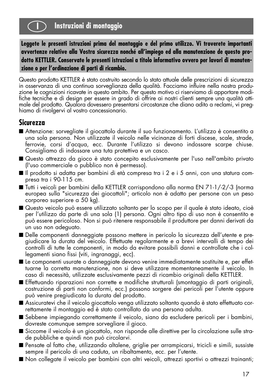 Sicurezza Attenzione: sorvegliate il giocattolo durante il suo funzionamento. L’utilizzo è consentito a una sola persona. Non utilizzate il veicolo nelle vicinanze di forti discese, scale, strade, ferrovie, corsi d’acqua, ecc. Durante l’utilizzo si devono indossare scarpe chiuse. Consigliamo di indossare una tuta protettiva e un casco. Questo attrezzo da gioco è stato concepito esclusivamente per l'uso nell'ambito privato (l'uso commerciale o pubblico non è permesso). Il prodotto si adatta per bambini di età compresa tra i 2 e i 5 anni, con una statura compresa tra i 90-115 cm. Tutti i veicoli per bambini della KETTLER corrispondono alla norma EN 71-1/-2/-3 (norma europea sulla "sicurezza dei giocattoli"; articolo non è adatto per persone con un peso corporeo superiore a 50 kg). Questo veicolo può essere utilizzato soltanto per lo scopo per il quale è stato ideato, cioè per l’utilizzo da parte di una sola (1) persona. Ogni altro tipo di uso non è consentito e può essere pericoloso. Non si può ritenere responsabile il produttore per danni derivati da un uso non adeguato. Delle componenti danneggiate possono mettere in pericolo la sicurezza dell’utente e pregiudicare la durata del veicolo. Effettuate regolarmente e a brevi intervalli di tempo dei controlli di tutte le componenti, in modo da evitare possibili danni e controllate che i collegamenti siano fissi (viti, ingranaggi, ecc). Le componenti usurate o danneggiate devono venire immediatamente sostituite e, per effettuarne la corretta manutenzione, non si deve utilizzare momentaneamente il veicolo. In caso di necessità, utilizzate esclusivamente pezzi di ricambio originali della KETTLER. Effettuando riparazioni non corrette e modifiche strutturali (smontaggio di parti originali, costruzione di parti non conformi, ecc.) possono sorgere dei pericoli per l’utente oppure può venire pregiudicata la durata del prodotto. Assicuratevi che il veicolo giocattolo venga utilizzato soltanto quando è stato effettuato correttamente il montaggio ed è stato controllato da una persona adulta. Sebbene impiegando correttamente il veicolo, siano da escludere pericoli per i bambini, dovreste comunque sempre sorvegliare il gioco. Siccome il veicolo è un giocattolo, non risponde alle direttive per la circolazione sulle strade pubbliche e quindi non può circolarvi. Pensate al fatto che, utilizzando altalene, griglie per arrampicarsi, tricicli e simili, sussiste sempre il pericolo di una caduta, un ribaltamento, ecc. per l’utente. Non collegate il veicolo per bambini con altri veicoli, attrezzi sportivi o attrezzi trainanti; 17