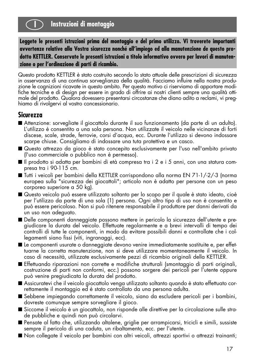 Sicurezza Attenzione: sorvegliate il giocattolo durante il suo funzionamento (da parte di un adulto). L’utilizzo è consentito a una sola persona. Non utilizzate il veicolo nelle vicinanze di forti discese, scale, strade, ferrovie, corsi d’acqua, ecc. Durante l’utilizzo si devono indossare scarpe chiuse. Consigliamo di indossare una tuta protettiva e un casco. Questo attrezzo da gioco è stato concepito esclusivamente per l'uso nell'ambito privato (l'uso commerciale o pubblico non è permesso). Il prodotto si adatta per bambini di età compresa tra i 2 e i 5 anni, con una statura compresa tra i 90-115 cm. Tutti i veicoli per bambini della KETTLER corrispondono alla norma EN 71-1/-2/-3 (norma europea sulla "sicurezza dei giocattoli"; articolo non è adatto per persone con un peso corporeo superiore a 50 kg). Questo veicolo può essere utilizzato soltanto per lo scopo per il quale è stato ideato, cioè per l’utilizzo da parte di una sola (1) persona. Ogni altro tipo di uso non è consentito e può essere pericoloso. Non si può ritenere responsabile il produttore per danni derivati da un uso non adeguato. Delle componenti danneggiate possono mettere in pericolo la sicurezza dell’utente e pregiudicare la durata del veicolo. Effettuate regolarmente e a brevi intervalli di tempo dei controlli di tutte le componenti, in modo da evitare possibili danni e controllate che i collegamenti siano fissi (viti, ingranaggi, ecc). Le componenti usurate o danneggiate devono venire immediatamente sostituite e, per effettuarne la corretta manutenzione, non si deve utilizzare momentaneamente il veicolo. In caso di necessità, utilizzate esclusivamente pezzi di ricambio originali della KETTLER. Effettuando riparazioni non corrette e modifiche strutturali (smontaggio di parti originali, costruzione di parti non conformi, ecc.) possono sorgere dei pericoli per l’utente oppure può venire pregiudicata la durata del prodotto. Assicuratevi che il veicolo giocattolo venga utilizzato soltanto quando è stato effettuato correttamente il montaggio ed è stato controllato da una persona adulta. Sebbene impiegando correttamente il veicolo, siano da escludere pericoli per i bambini, dovreste comunque sempre sorvegliare il gioco. Siccome il veicolo è un giocattolo, non risponde alle direttive per la circolazione sulle strade pubbliche e quindi non può circolarvi. Pensate al fatto che, utilizzando altalene, griglie per arrampicarsi, tricicli e simili, sussiste sempre il pericolo di una caduta, un ribaltamento, ecc. per l’utente. Non collegate il veicolo per bambini con altri veicoli, attrezzi sportivi o attrezzi trainanti; 17