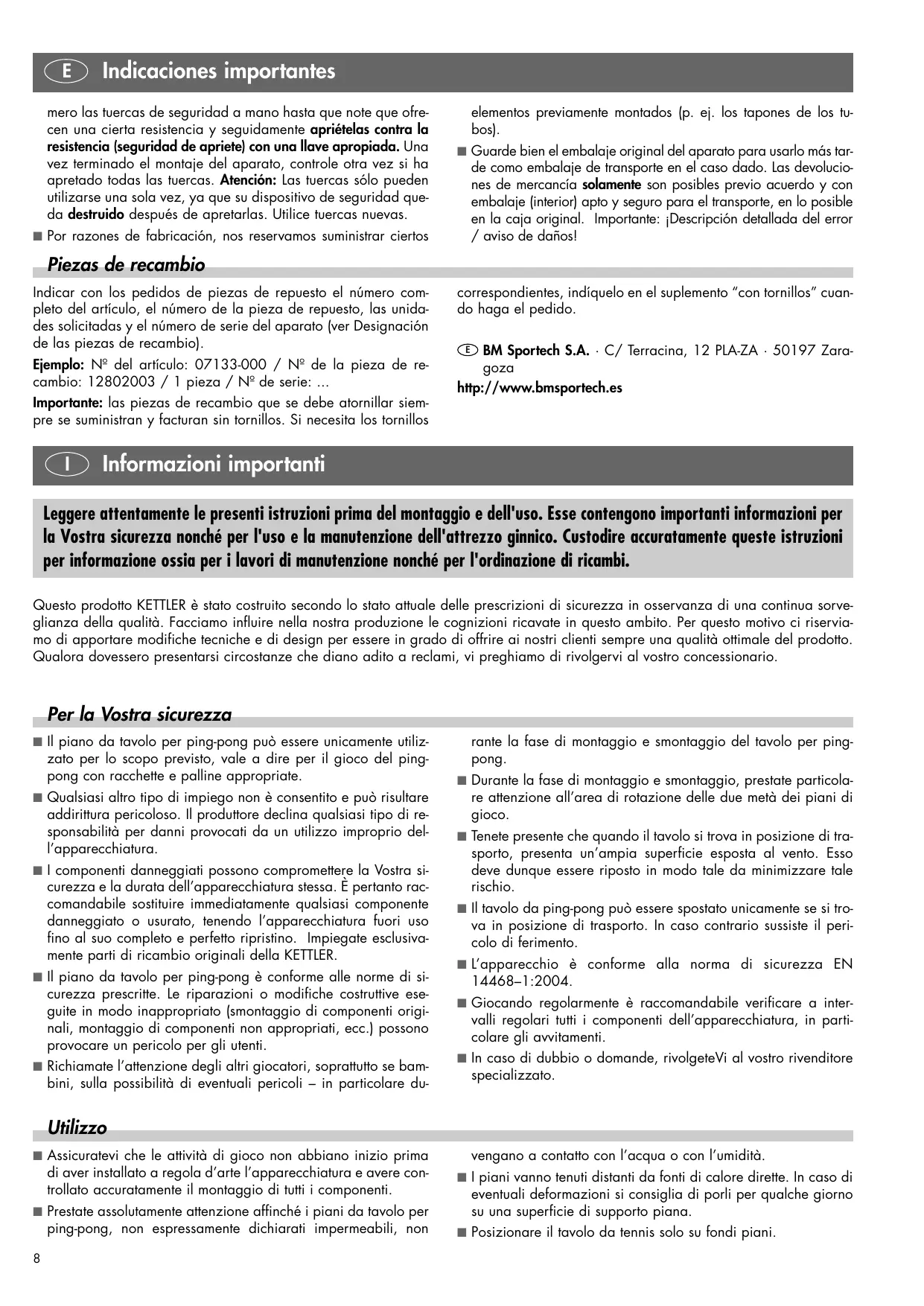 Informazioni importanti Leggere attentamente le presenti istruzioni prima del montaggio e dell'uso. Esse contengono importanti informazioni per la Vostra sicurezza nonché per l'uso e la manutenzione dell'attrezzo ginnico. Custodire accuratamente queste istruzioni per informazione ossia per i lavori di manutenzione nonché per l'ordinazione di ricambi. Questo prodotto KETTLER è stato costruito secondo lo stato attuale delle prescrizioni di sicurezza in osservanza di una continua sorveglianza della qualità. Facciamo influire nella nostra produzione le cognizioni ricavate in questo ambito. Per questo motivo ci riserviamo di apportare modifiche tecniche e di design per essere in grado di offrire ai nostri clienti sempre una qualità ottimale del prodotto. Qualora dovessero presentarsi circostanze che diano adito a reclami, vi preghiamo di rivolgervi al vostro concessionario. Per la Vostra sicurezza I Il piano da tavolo per ping-pong può essere unicamente utiliz- zato per lo scopo previsto, vale a dire per il gioco del pingpong con racchette e palline appropriate. I Qualsiasi altro tipo di impiego non è consentito e può risultare addirittura pericoloso. Il produttore declina qualsiasi tipo di responsabilità per danni provocati da un utilizzo improprio dell’apparecchiatura. I I componenti danneggiati possono compromettere la Vostra si- curezza e la durata dell’apparecchiatura stessa. È pertanto raccomandabile sostituire immediatamente qualsiasi componente danneggiato o usurato, tenendo l’apparecchiatura fuori uso fino al suo completo e perfetto ripristino. Impiegate esclusivamente parti di ricambio originali della KETTLER. I Il piano da tavolo per ping-pong è conforme alle norme di si- curezza prescritte. Le riparazioni o modifiche costruttive eseguite in modo inappropriato (smontaggio di componenti originali, montaggio di componenti non appropriati, ecc.) possono provocare un pericolo per gli utenti. I Richiamate l’attenzione degli altri giocatori, soprattutto se bam- bini, sulla possibilità di eventuali pericoli – in particolare du- rante la fase di montaggio e smontaggio del tavolo per pingpong. I Durante la fase di montaggio e smontaggio, prestate particola- re attenzione all’area di rotazione delle due metà dei piani di gioco. I Tenete presente che quando il tavolo si trova in posizione di tra- sporto, presenta un’ampia superficie esposta al vento. Esso deve dunque essere riposto in modo tale da minimizzare tale rischio. I Il tavolo da ping-pong può essere spostato unicamente se si tro- va in posizione di trasporto. In caso contrario sussiste il pericolo di ferimento. I L’apparecchio è conforme alla norma di sicurezza EN 14468–1:2004. I Giocando regolarmente è raccomandabile verificare a inter- valli regolari tutti i componenti dell’apparecchiatura, in particolare gli avvitamenti. I In caso di dubbio o domande, rivolgeteVi al vostro rivenditore specializzato. Utilizzo I Assicuratevi che le attività di gioco non abbiano inizio prima di aver installato a regola d’arte l’apparecchiatura e avere controllato accuratamente il montaggio di tutti i componenti. I Prestate assolutamente attenzione affinché i piani da tavolo per ping-pong, non espressamente dichiarati impermeabili, non