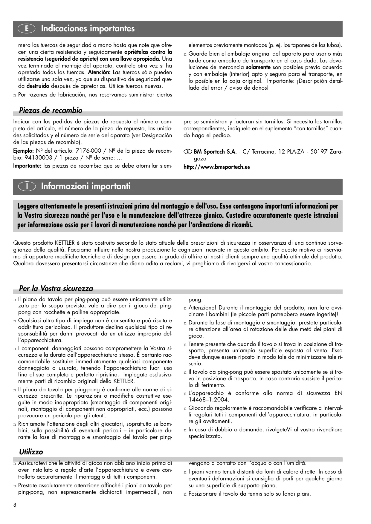 Informazioni importanti n Per coprire i piani non utilizzare teloni di plastica che possano n Per la pulizia e la cura usate solo mezzi ecologici, ma in nes- formare condensa. È consigliabile adoperare i teloni impermeabili della KETTLER, no. articolo 7032-300. sun caso mezzi aggressivi o corrosivi. Generalmente basta un panno leggermente inumidito. n Per allenarsi individualmente è possibile ribaltare in modo sin- n Indicazione sullo smaltimento: I prodotti KETTLER sono recicla- golo ambedue i piani di gioco. bill. Quando l’apparecchio non servirà più, portatelo in un apposito punto di raccolta della Vostra città (Punti di raccolta comunall). n Potete trovare le indicazioni generali relative allo sport del ping-pong e alle sue regole di gioco, consultando la letteratura specializzata. Istruzioni di montaggio n Il montaggio deve essere eseguito accuratamente da due per- dimento di montaggio viene riprodotto nelle singole illustrazioni che sono inoltre evidenziate in lettere maiuscole. sone adulte. n Controllare immediatamente dopo la ricezione se sono presen- n Il materiale d'avvitatura necessario per il montaggio è illustrato ti tutti i componenti appartenenti alla dotazione (si veda la lista di controllo) e se sono presenti dei danni di trasporto. In caso di eventuali contestazioni, Vi preghiamo di rivolgerVi al Vostro rivenditore di fiducia. nella rispettiva barra delle figure, e deve essere impiegato come mostrato nelle rispettive illustrazioni. n Avvitare dapprima tutti i componenti, senza serrarli definitiva- mente, e controllarne successivamente la sede fissa. Avvitare i dadi autobloccanti a mano fino ad un sensibile punto di resistenza e serrarli successivamente oltre questo punto di resistenza (sicura bloccante) con un'apposita chiave. Controllare tutti i raccordi filettati dopo il montaggio, per accertarsi che abbiano una sede fissa. Attenzione: i dadi di sicurezza allentati non sono più utilizzabili (distruzione della sicura bloccante) e devono perciò essere sostituiti con dei nuovi. n Ogni volta che si utilizzano degli utensili e durante l'esecuzione dei lavori non sono mai da escludere dei possibili pericoli di riscontrare delle lesioni. Pertanto, si raccomanda di procedere sempre con la massima prudenza durante le operazioni di montaggio dell'attrezzo ginnico! n Lavorare sempre in ambienti esenti da qualsiasi pericolo e non lasciare ad esempio in giro inutilmente gli utensili di lavoro. Deporre ad esempio il materiale d'imballaggio in maniera tale da escludere qualsiasi pericolo. Mantenere al di fuori della portata dei bambini pellicole o sacchetti di materiale sintetico. Pericolo d'asfissia! n Per motivi tecnici di produzione ci riserviamo il premontaggio dei componenti costruttivi (ad esempio tappi per tubi). n La merce può essere rispedita al mittente solo dietro previo ac- cordo col medesimo, utilizzando un imballaggio adatto al trasporto e se possibile riutilizzando la scatola originale.È importante fornire una descrizione dettagliata dell’errore o del danno! n Osservare attentamente e con calma i disegni e montare l'attrezzo ginnico secondo l'ordine delle illustrazioni. Il proce- Parti di ricambio Per l’ordinazione di parti di ricambio indicate il completo numero di articolo, della parte di ricambio, il numero di unit necessario nonchè il numero di serie dell’apparecchio (vedasi “Disegno dei pezzi di ricambio”). vesse necessitare dell’apposito materiale di avvita-mento, questo va indicato in occasione dell’ordinazione della parte di ricambio aggiungendo „con materiale di avvitamento“. Esempio di ordinazione: n. art. 7176-000 /n. parte di ricambio 94130003 / 2 unit /n. di serie... Importante: le parti di ricambio da avvitare vengono fatturate e fornite di principio senza materiali di avvitamento. Qualora si do- KETTLER SRL Strada Per Pontecurone 5 · I–15053 Castelnuovo Scriva (AL) http://www.kettler.de