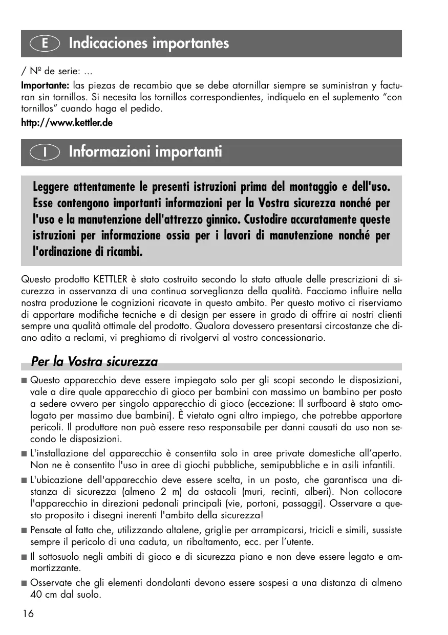 Scarica le istruzioni per il tuo Altalena in formato PDF gratuitamente! Trova il tuo manuale SCHAUKEL 8382-700 - KETTLER e riprendi in mano il tuo dispositivo elettronico. In questa pagina sono pubblicati tutti i documenti necessari per l'utilizzo del tuo dispositivo. SCHAUKEL 8382-700 del marchio KETTLER.