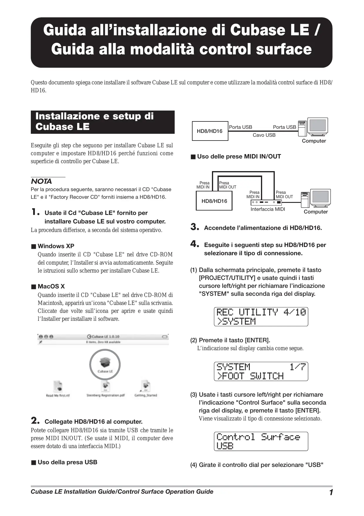 Guida all’installazione di Cubase LE / Guida alla modalità control surface Questo documento spiega cone installare il software Cubase LE sul computer e come utilizzare la modalità control surface di HD8/ HD16. Installazione e setup di Cubase LE Eseguite gli step che seguono per installare Cubase LE sul computer e impostare HD8/HD16 perché funzioni come superficie di controllo per Cubase LE. NOTA Per la procedura seguente, saranno necessari il CD "Cubase LE" e il “Factory Recover CD" forniti insieme a HD8/HD16. 1 . Usate il Cd "Cubase LE" fornito per installare Cubase LE sul vostro computer. La procedura differisce, a seconda del sistema operativo. E Windows XP Quando inserite il CD "Cubase LE" nel drive CD-ROM del computer, l’Installer si avvia automaticamente. Seguite le istruzioni sullo schermo per installare Cubase LE. EE MacOS X Quando inserite il CD "Cubase LE" nel drive CD-ROM di Macintosh, apparirà un'icona "Cubase LE" sulla scrivania. Cliccate due volte sull'icona per aprire e usate quindi l’Installer per installare il software. eee Gears