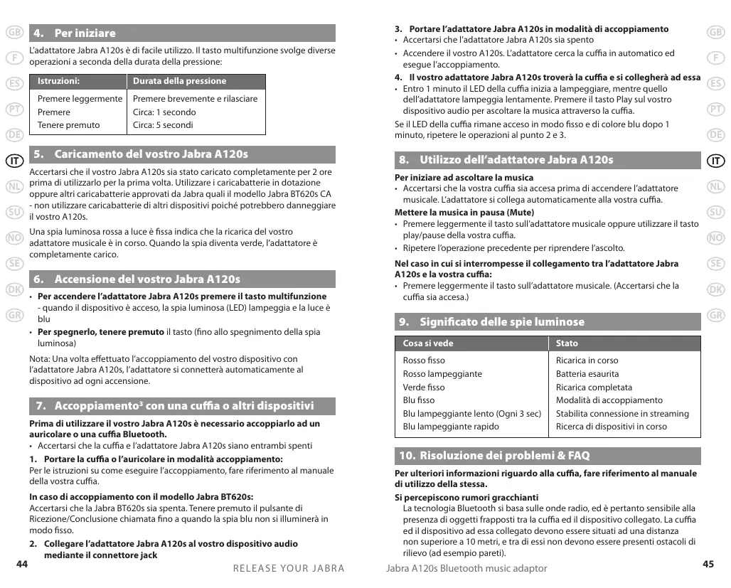 3. Portare l’adattatore Jabra A120s in modalità di accoppiamento GB • Accertarsi che l’adattatore Jabra A120s sia spento • Accendere il vostro A120s. L’adattatore cerca la cuffia in automatico ed F esegue l’accoppiamento. 4. Il vostro adattatore Jabra A120s troverà la cuffia e si collegherà ad essa ES • Entro 1 minuto il LED della cuffia inizia a lampeggiare, mentre quello dell’adattatore lampeggia lentamente. Premere il tasto Play sul vostro PT dispositivo audio per ascoltare la musica attraverso la cuffia. Se il LED della cuffia rimane acceso in modo fisso e di colore blu dopo 1 minuto, ripetere le operazioni al punto 2 e 3. DE
