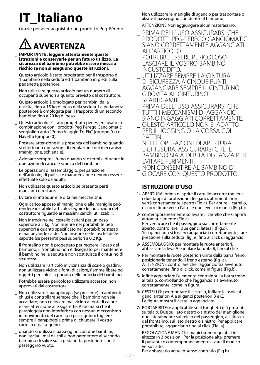 _ IMPORTANTE: leggere attentamente queste istruzioni e conservarle per un futuro utilizzo. La sicurezza del bambino potrebbe essere messa a rischio se non si eseguono queste istruzioni. _ Questo articolo è stato progettato per il trasporto di 1 bambino nella seduta ed 1 bambino in piedi sulla pedanetta posteriore. _ Non utilizzare questo articolo per un numero di occupanti superiori a quanto previsto dal costruttore. _ Questo articolo è omologato per bambini dalla nascita, fino a 15 kg di peso nella seduta. La pedanetta posteriore è omologata per il trasporto di un secondo bambino fino a 20 kg di peso. _ Questo articolo e' stato progettato per essere usato in combinazione con i prodotti Peg Perego Ganciomatic: seggiolino auto "Primo Viaggio Tri-Fix" (gruppo 0+) o Navetta (gruppo 0). _ Prestare attenzione alla presenza del bambino quando si effettuano operazioni di regolazione dei meccanismi (maniglione, schienale). _ Azionare sempre il freno quando si è fermi e durante le operazioni di carico e scarico del bambino. _ Le operazioni di assemblaggio, preparazione dell’articolo, di pulizia e manutenzione devono essere effettuate solo da adulti. _ Non utilizzate questo articolo se presenta parti mancanti o rotture. _ Evitare di introdurre le dita nei meccanismi. _ Ogni carico appeso al maniglione o alle maniglie può rendere instabile l'articolo; seguire le indicazioni del costruttore riguardo ai massimi carichi utilizzabili. _ Non introdurre nel cestello carichi per un peso superiore a 5 kg. Non inserire nei portabibite pesi superiori a quanto specificato nel portabibite stesso e mai bevande calde. Non inserire nelle tasche delle capotte (se presenti) pesi superiori a 0.2 Kg. _ Il frontalino non è progettato per reggere il peso del bambino; il frontalino non è disegnato per mantenere il bambino nella seduta e non sostituisce il cinturino di sicurezza. _ Non utilizzare l'articolo in vicinanza di scale o gradini; non utilizzare vicino a fonti di calore, fiamme libere od oggetti pericolosi a portata delle braccia del bambino. _ Potrebbe essere pericoloso utilizzare accessori non approvati dal costruttore. _ Non utilizzare il parapioggia (se presente) in ambienti chiusi e controllare sempre che il bambino non sia accaldato; non collocare mai vicino a fonti di calore e fare attenzione alle sigarette. Assicurarsi che il parapioggia non interferisca con nessun meccanismo in movimento del carrello o passeggino; togliere sempre il parapioggia prima di chiudere il vostro carrello o passeggino. _ quando si utilizza il passeggino con due bambini, non lasciarli mai da soli e non permettere al secondo bambino di salire sulla pedanetta posteriore con il passeggino vuoto.