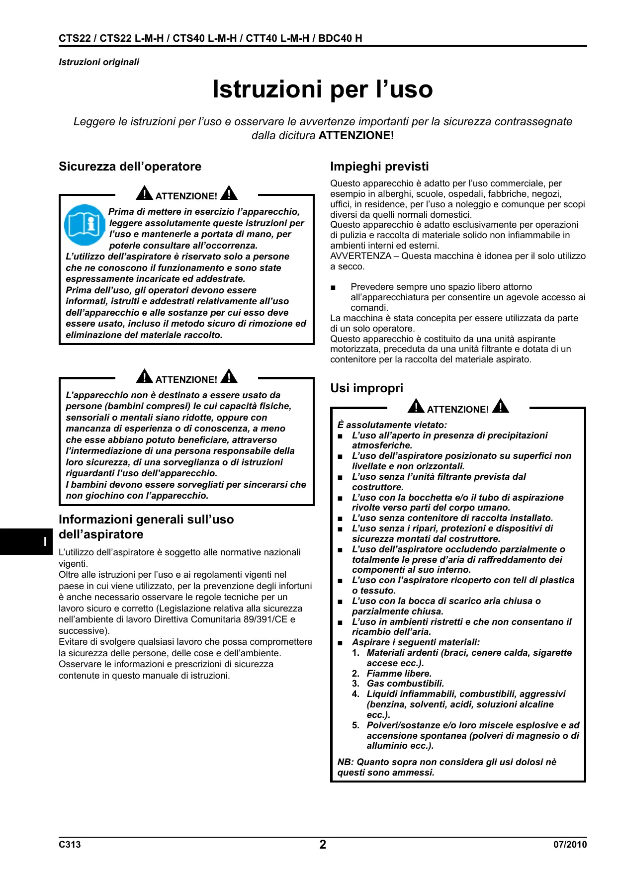 Si la aspiradora descarga el aire del tubo de vacío, la dirección de rotación no es correcta; desconecte el enchufe de la toma de corriente y póngase en contacto con el personal de asistencia cualificado para efectuar la conexión de fase correcta. 2° CTS22 L, M, H - CTS40 L, M, H - BDC40 H Si la aspiradora no aspira aire, la dirección de rotación no es correcta; desconecte el enchufe de la toma de corriente y póngase en contacto con el personal de asistencia cualificado para efectuar la conexión de fase correcta.