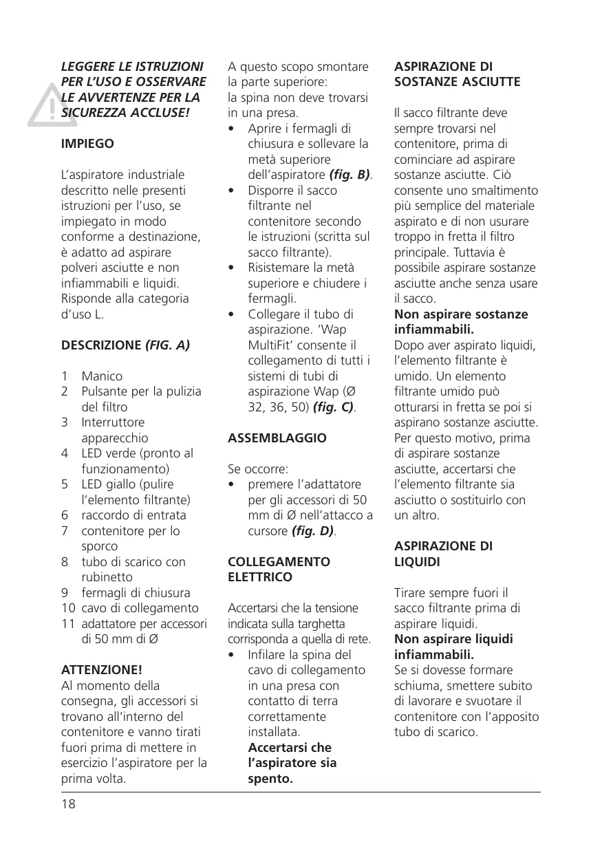 • Ouvrir les crochets de fermeture et déposer la partie supérieure de l’aspirateur (Fig. B). • Introduire le sac à poussière dans la cuve conformément à la notice (imprimée sur le sac). • Remettre la partie supérieure de l’aspirateur et fermer les crochets. • Raccorder le tuyau flexible d’aspiration. Le raccord ‘Wap MultiFit’ permet de connecter tous les systèmes de tuyaux flexibles d’aspiration Wap (Ø 32, 36, 50) (Fig. C). ASSEMBLAGE Au besoin : • Emboîter l’adaptateur pour accessoire de Ø 50 mm dans la poignée (Fig. D). BRANCHEMENT ELECTRIQUE La tension de service indiquée sur la plaque signalétique doit correspondre à la tension du réseau de distribution. • Brancher la fiche du cordon dans une prise secteur de sécurité installée de façon réglementaire.