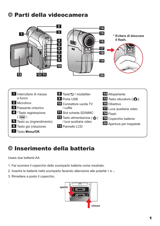 17 Luce ausiliaria video 18 Flash 19 Coperchio batteria 20 Apertura per treppiede