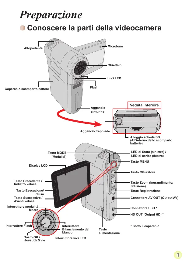 Sommario Preparazione 1 Conoscere la parti della videocamera 1 Inserimento della batteria 2 Caricamento della batteria 2 Inserimento di una scheda memoria (optional) 3 Accendere e spegnere la videocamera 3 Impostazione della lingua 4 Impostazione dell’ora 4 Lettura degli indicatori del display LCD 5