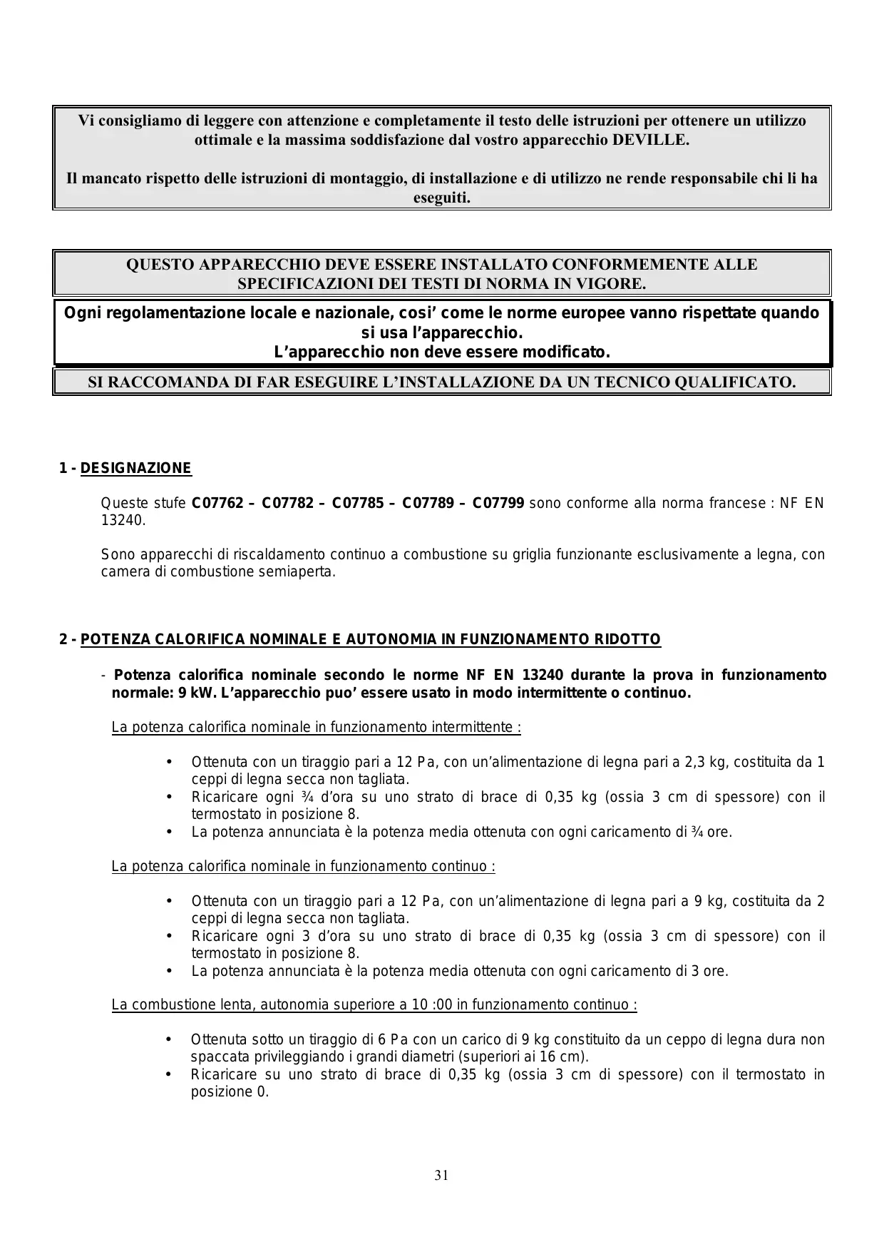 Vi consigliamo di leggere con attenzione e completamente il testo delle istruzioni per ottenere un utilizzo ottimale e la massima soddisfazione dal vostro apparecchio DEVILLE. Il mancato rispetto delle istruzioni di montaggio, di installazione e di utilizzo ne rende responsabile chi li ha eseguiti. QUESTO APPARECCHIO DEVE ESSERE INSTALLATO CONFORMEMENTE ALLE SPECIFICAZIONI DEI TESTI DI NORMA IN VIGORE. Ogni regolamentazione locale e nazionale, cosi’ come le norme europee vanno rispettate quando si usa l’apparecchio. L’apparecchio non deve essere modificato. SI RACCOMANDA DI FAR ESEGUIRE L’INSTALLAZIONE DA UN TECNICO QUALIFICATO.