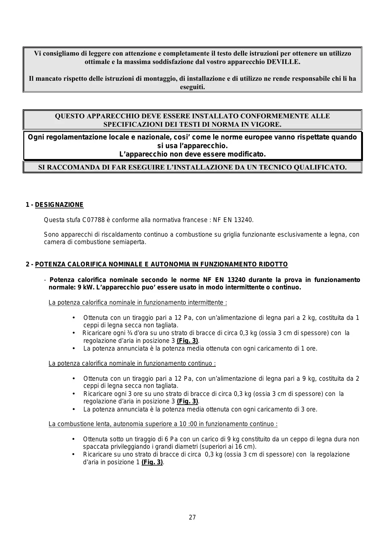 Vi consigliamo di leggere con attenzione e completamente il testo delle istruzioni per ottenere un utilizzo ottimale e la massima soddisfazione dal vostro apparecchio DEVILLE. Il mancato rispetto delle istruzioni di montaggio, di installazione e di utilizzo ne rende responsabile chi li ha eseguiti. QUESTO APPARECCHIO DEVE ESSERE INSTALLATO CONFORMEMENTE ALLE SPECIFICAZIONI DEI TESTI DI NORMA IN VIGORE. Ogni regolamentazione locale e nazionale, cosi’ come le norme europee vanno rispettate quando si usa l’apparecchio. L’apparecchio non deve essere modificato. SI RACCOMANDA DI FAR ESEGUIRE L’INSTALLAZIONE DA UN TECNICO QUALIFICATO.
