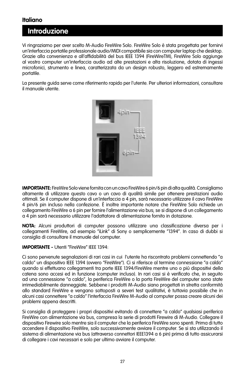 Italiano Introduzione Vi ringraziamo per aver scelto M-Audio FireWire Solo. FireWire Solo è stata progettata per fornirvi un’interfaccia portatile professionale audio/MIDI compatibile sia con computer laptop che desktop. Grazie alla convenienza e all’affidabilità del bus IEEE 1394 (FireWireTM), FireWire Solo aggiunge al vostro computer un’interfaccia audio ad alte prestazioni e alta risoluzione, dotata di ingessi microfonici, strumento e linea, caratterizzata da un design robusto, leggero ed estremamente portatile. La presente guida serve come riferimento rapido per l’utente. Per ulteriori informazioni, consultare il manuale utente. IMPORTANTE: FireWire Solo viene fornita con un cavo FireWire 6 pin/6 pin di alta qualità. Consigliamo altamente di utilizzare questo cavo o un cavo di qualità simile per ottenere prestazioni audio ottimali. Se il computer dispone di un’interfaccia a 4 pin, sarà necessario utilizzare il cavo FireWire 4 pin/6 pin incluso nella confezione. È inoltre importante notare che FireWire Solo richiede un collegamento FireWire a 6 pin per fornire l’alimentazione via bus; se si dispone di un collegamento a 4 pin sarà necessario utilizzare l’adattatore di alimentazione fornito in dotazione. NOTA: Alcuni produttori di computer possono utilizzare una classificazione diversa per i collegamenti FireWire, ad esempio “iLink” di Sony o semplicemente “1394”. In caso di dubbi si consiglia di consultare il manuale del computer. IMPORTANTE - Utenti “FireWire” IEEE 1394: Ci sono pervenute segnalazioni di rari casi in cui l’utente ha riscontrato problemi connettendo “a caldo” un dispositivo IEEE 1394 (ovvero “FireWire”). Ci si riferisce al termine connessione “a caldo” quando si effettuano collegamenti tra porte IEEE 1394/FireWire mentre uno o più dispositivi della catena sono accesi ed in funzione (computer incluso). In rari casi si è verificato che, in seguito ad una connessione “a caldo”, la periferica FireWire o la porta FireWire del computer sono state irrimediabilmente danneggiate. Sebbene i prodotti M-Audio siano progettati in stretta conformità allo standard FireWire e vengano sottoposti a severi test qualitativi, è tuttavia possibile che in alcuni casi connettere “a caldo” l’interfaccia FireWire M-Audio al computer possa creare alcuni dei problemi appena descritti. Si consiglia di proteggere i propri dispositivi evitando di connettere “a caldo” qualsiasi periferica FireWire con alimentazione via bus, compresa la serie di prodotti Firewire di M-Audio. Collegare il dispositivo Firewire solo mentre sia il computer che la periferica FireWire sono spenti. Prima di tutto accendere il dispositivo FireWire, solo successivamente avviare il computer. Se si sta utilizzando il sistema di alimentazione via bus (attraverso connettori IEEE1394 a 6 pin) prima di tutto assicurarsi di collegare i cavi necessari e solo per ultimo avviare il computer.